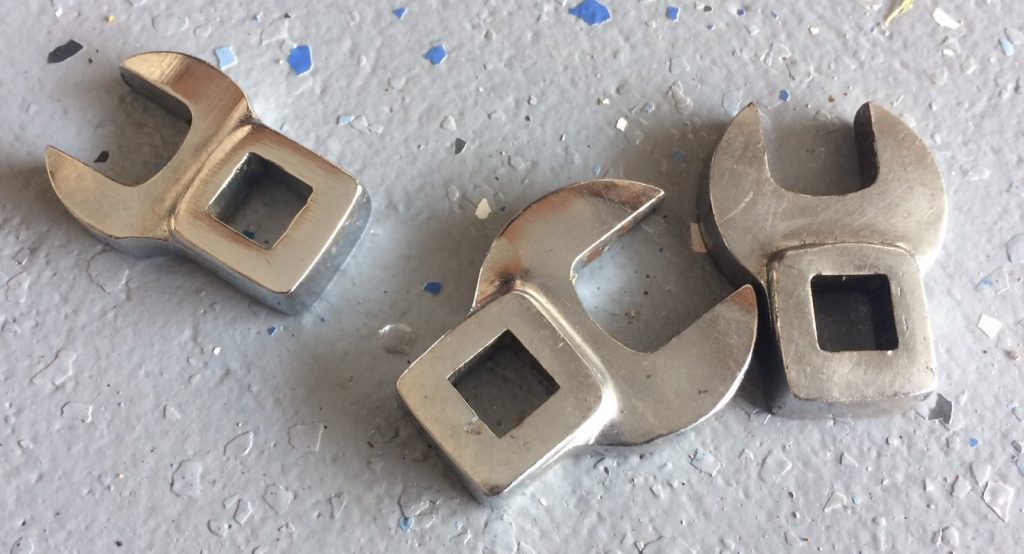 There’s nothing fancy about our particular serpentine belt tool. It’s just two flat bars with a 3/8 inch and 1/2 inch drive ends. Ours came with some crowfoot wrenches too, which we’ll get to in a sec.