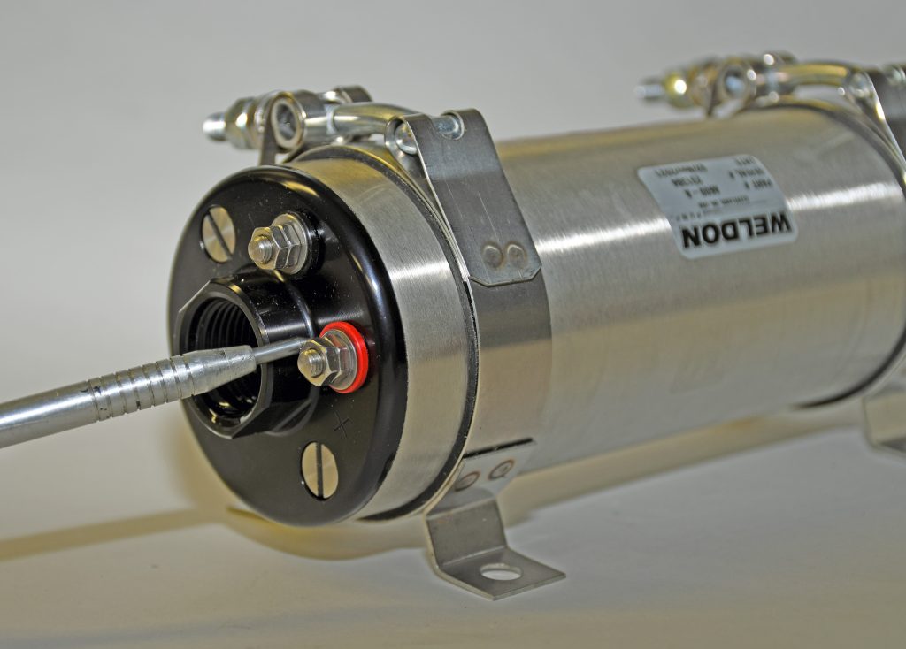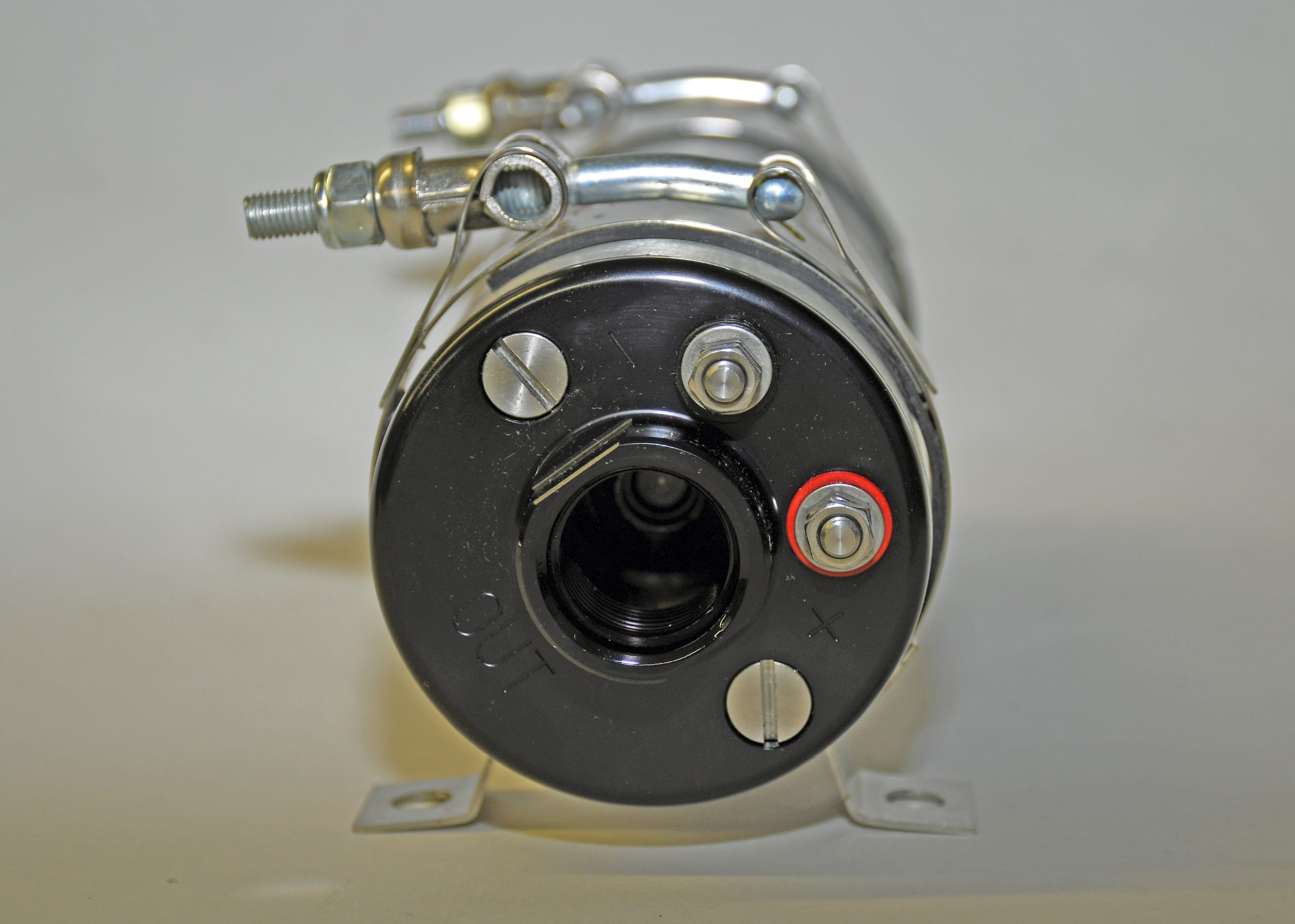 In terms of construction, the Weldon A-600-A pump is manufactured with a 304 stainless steel housing. The end caps are Mil-Spec black anodized billet aluminum. Internal components are 100% metallic (no plastic bits) and the electric connections are located on the outlet side. Inlet and outlet ports along with the electrical terminals (+ and -) are clearly marked. The pump includes two insulated aircraft style t-bolt mounting clamps.