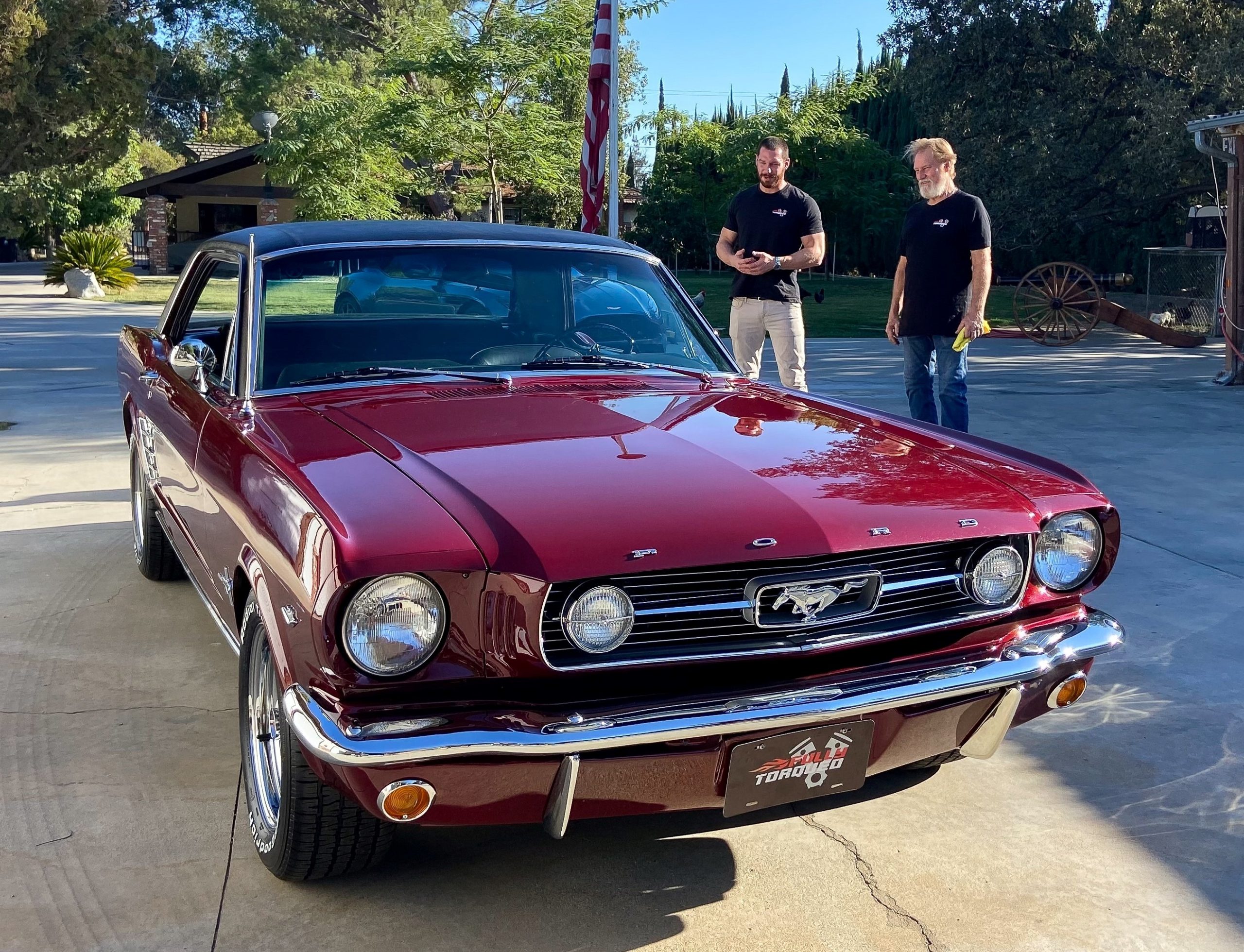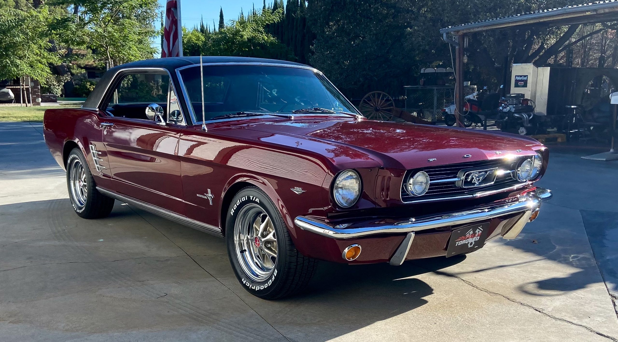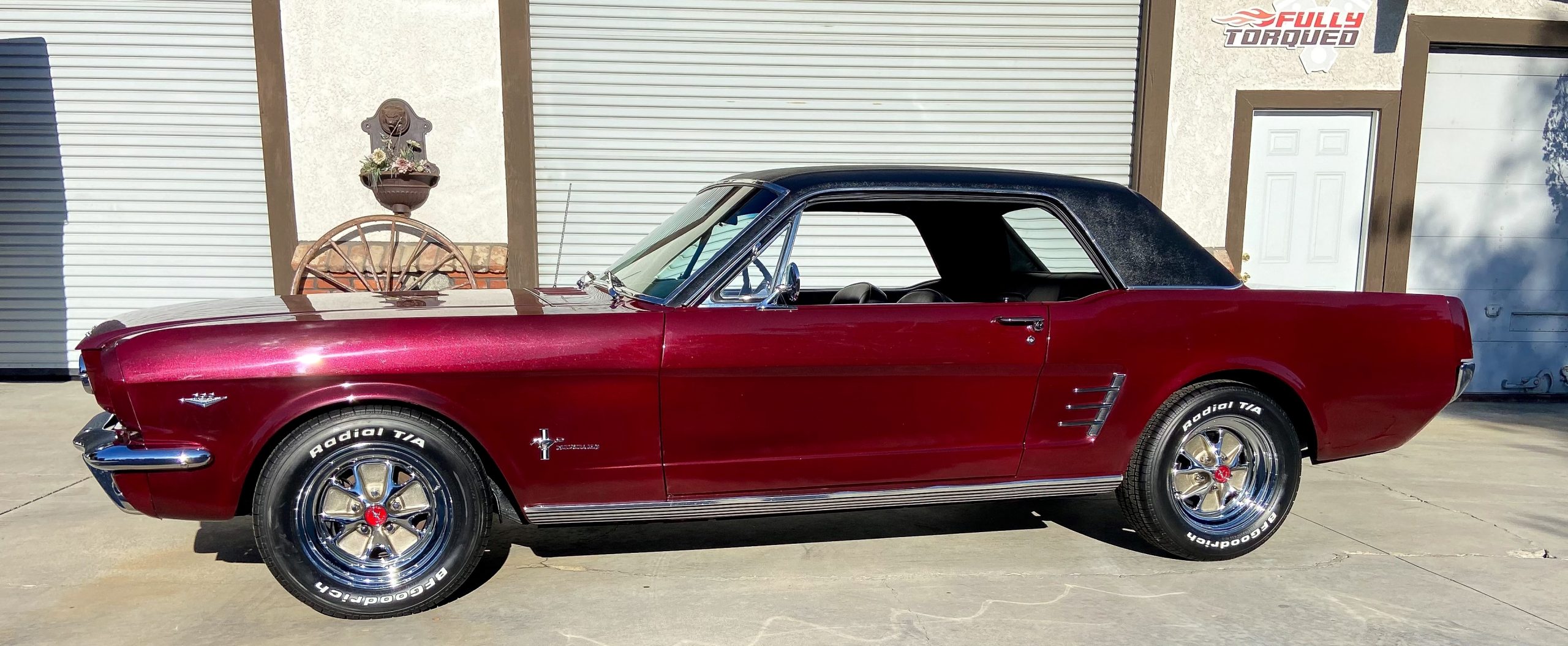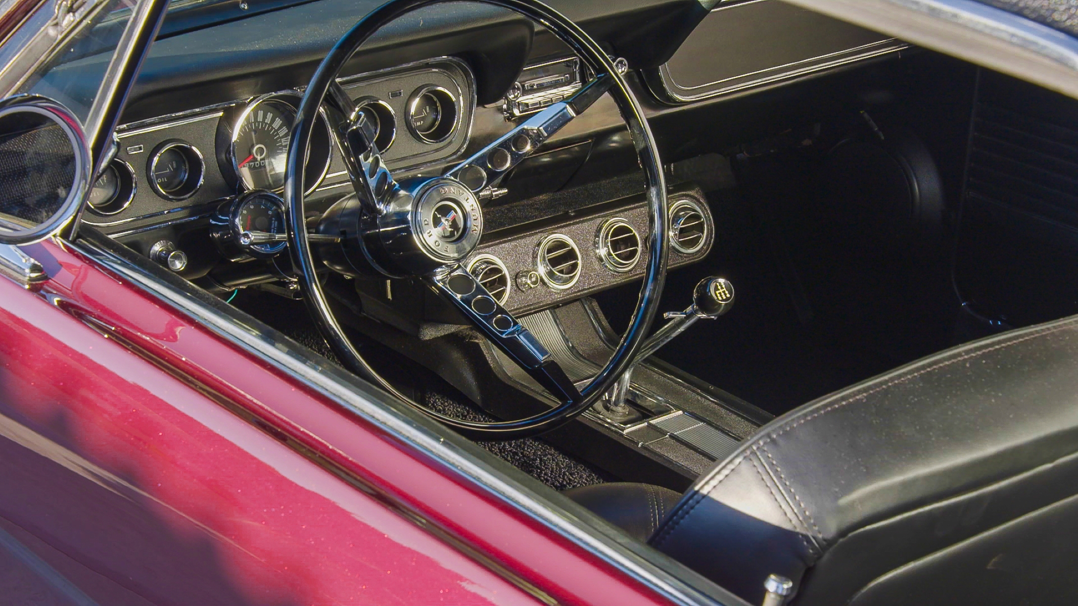 The chassis was rehabbed with KYB shocks, Moog front control arms, and a Borgeson power steering conversion kit, and the Mustang’s body got a new floor, door shells, and a bunch of new trim before it was repainted in the original burgundy.