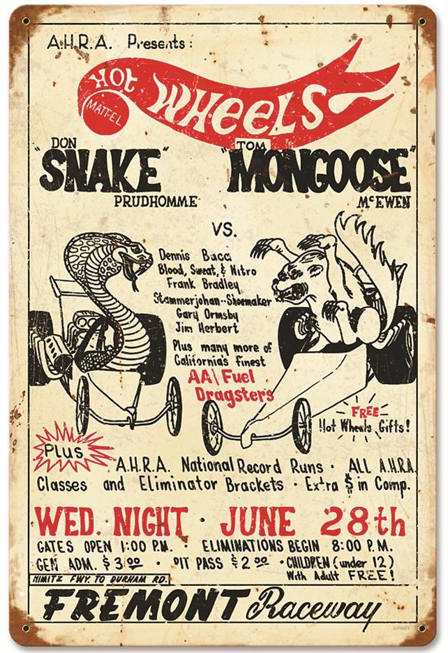 And speaking of tracks, Mattel’s marketing team fully realized the overlap between drag racing’s popularity and toy car sales. In one of racing’s most famous sponsorships, the Hot Wheels logo was painted prominently on the dragsters of Don “Snake” Prudhomme and Tom “Mongoose” McEwen as the two racers squared off throughout the 1970s.