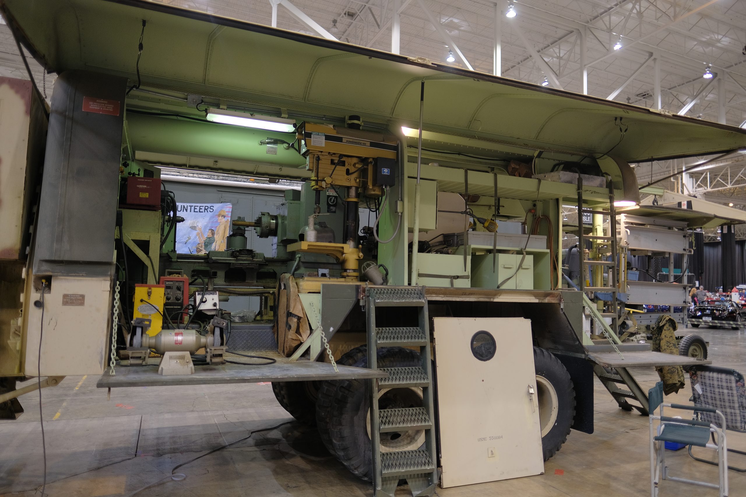 The Shop Equipment, General Purpose Repair, Semi-Trailer Mounted machinist van is used to repair and maintain mechanical equipment in the field. This one, built in 1989, includes features such as a drill press, grinder, industrial honing machine, a lathe, and more.