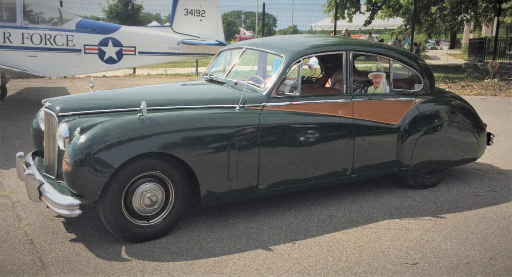 A plane that needs no introduction, this particular Mustang “Gunfighter” is a two-seat P-51D variant and one of the many aircraft operated by the Commemorative Air Force. (Image/OnAllCylinders – Alan Sakalas)A Willys MB is always a welcome sight. (Image/OnAllCylinders)This AT-6 Texan, dubbed “Nella” is part of the CAF’s WASP Squadron, which highlights the role of the Women Airforce Service Pilots. Read all about it here. (Image/OnAllCylinders – Alan Sakalas)Squint your eyes a bit and you’ll see some family resemblance to the legendary P-51 Mustang in this 1947 Navion—they were both designed by North American Aviation. This one’s part of the Cincinnati Warbirds group. (Image/OnAllCylinders)Plenty of other classic cars showed up too, like this postwar Jaguar saloon with a very special passenger. (Image/OnAllCylinders)Easily dwarfed by the B-29 in the background, the Beechcraft T-34 was one of many trainers developed after World War 2. This one is part of the CAF’s Florida Wing. (Image/OnAllCylinders)While they may not have the fame of a Jeep, plenty of civilian vehicles donned olive drab for military service, like this Plymouth Special Deluxe Staff Car. (Image/OnAllCylinders)Here’s a 1943 Fairchild PT-26 operated by the CAF’s Buckeye Wing. It’s wearing the colors of the Canadian Royal Air Force, where it served as a primary trainer during World War 2. Note Cincinnati’s historic Lunken Airport Terminal in the background. (Image/OnAllCylinders)