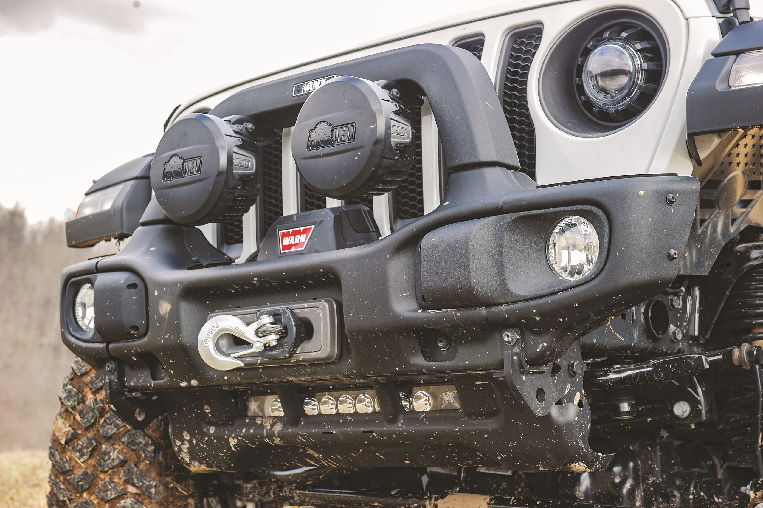 It starts with bolting up an AEV Conversions RX Front Bumper. Not only does this bumper add some much-welcome protection up front, it provides a great spot to mount the Warn VR EVO 10-S Winch and auxiliary off-road lights. And in sticking with the overall theme of the project, this bumper adds plenty of tire clearance, without being too big and bulky to prevent the Wrangler from fitting into an ordinary parking spot.