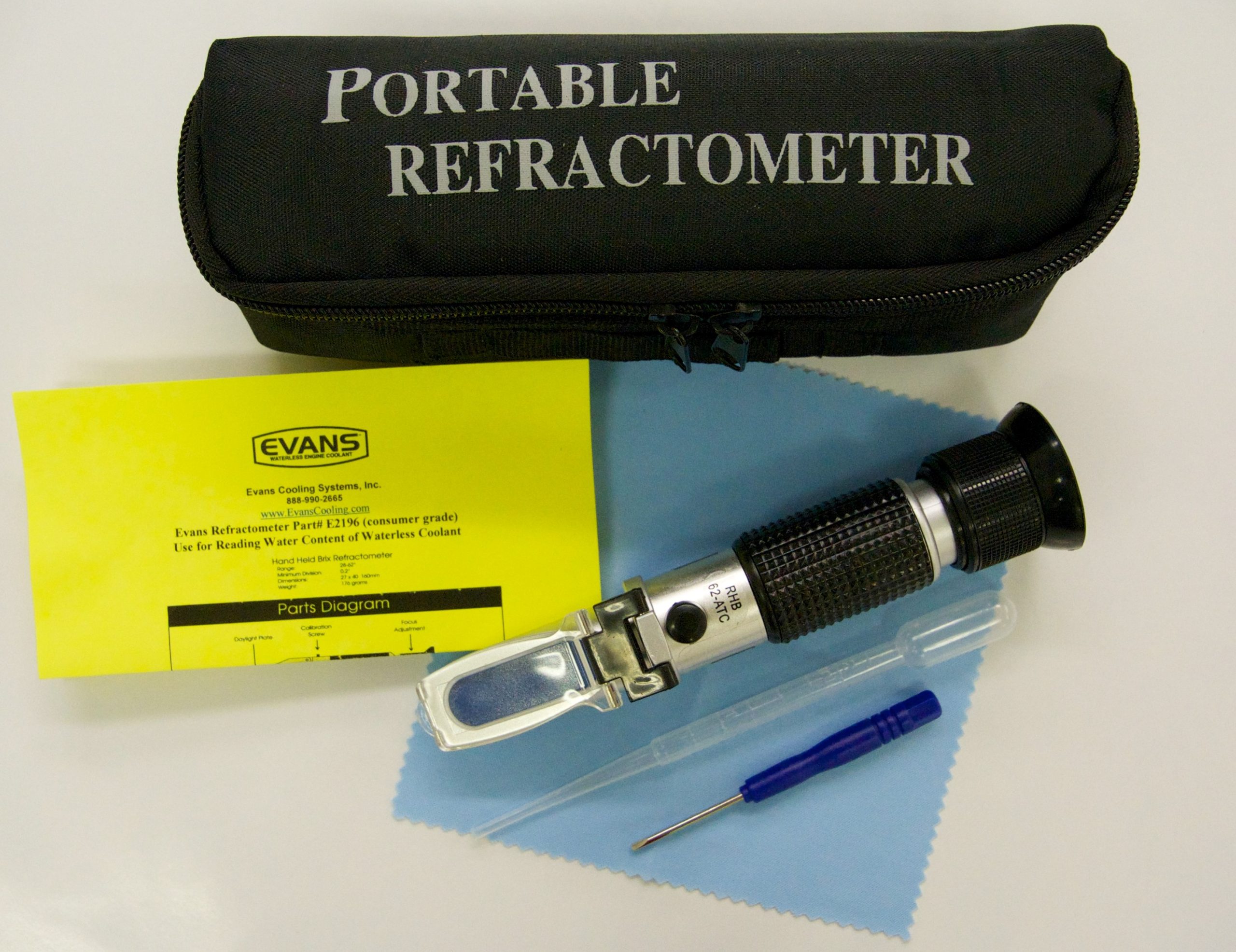 - When you have finished the conversion to Evans Waterless Coolant, you will need to test it with a refractometer to ensure that the water content is below five percent maximum. Summit Racing carries an Evans refractometer for the job.
