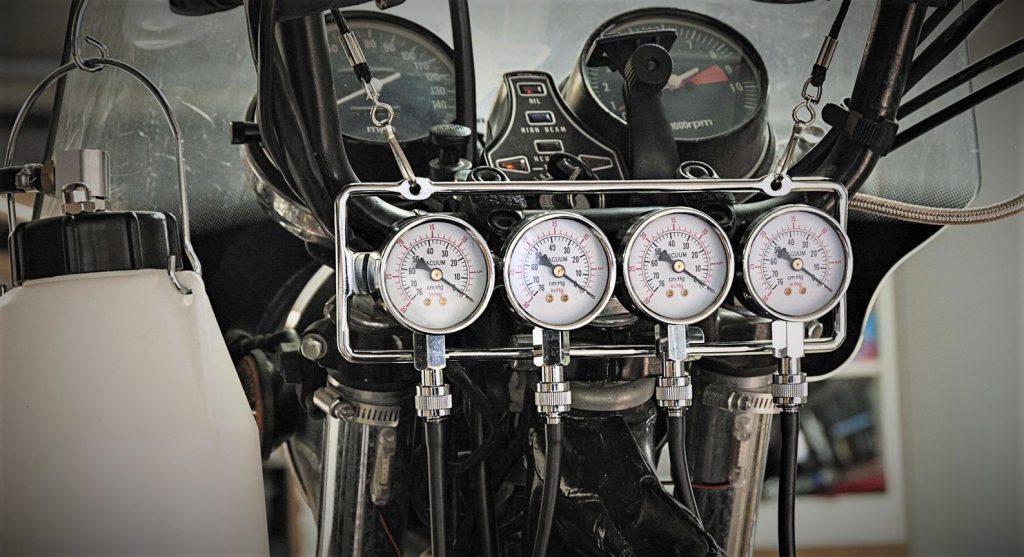 One features vertical transparent tubes filled with fluid. You connect each tube to a separate cylinder’s vacuum port on the bike. The other style of carb sync tool uses large dial vacuum gauges. As before, you connect each gauge to a distinct vacuum port.