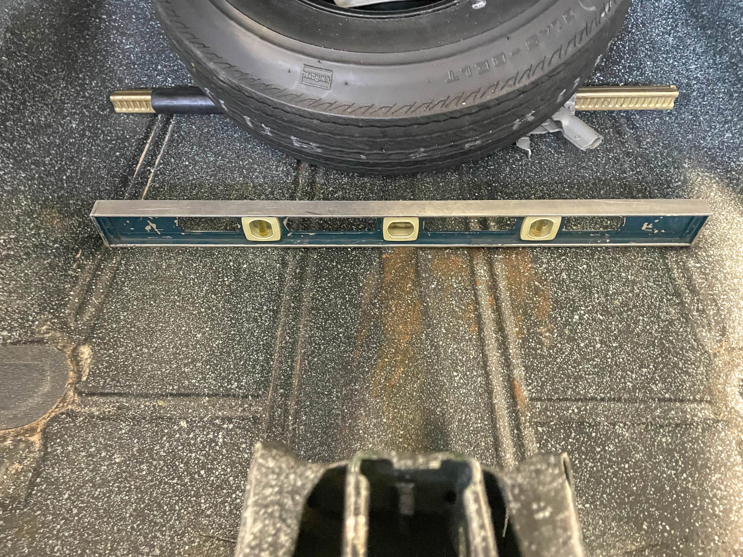 The first thing to do is to find a level location on your shop floor. Some shops like mine have floor drains, which means the floor slopes slightly in certain spots. In my case, the two outer bays have drains. The middle of the shop doesn’t, and here, the floor is level. Once you find a level location, set the tire pressure front and rear.