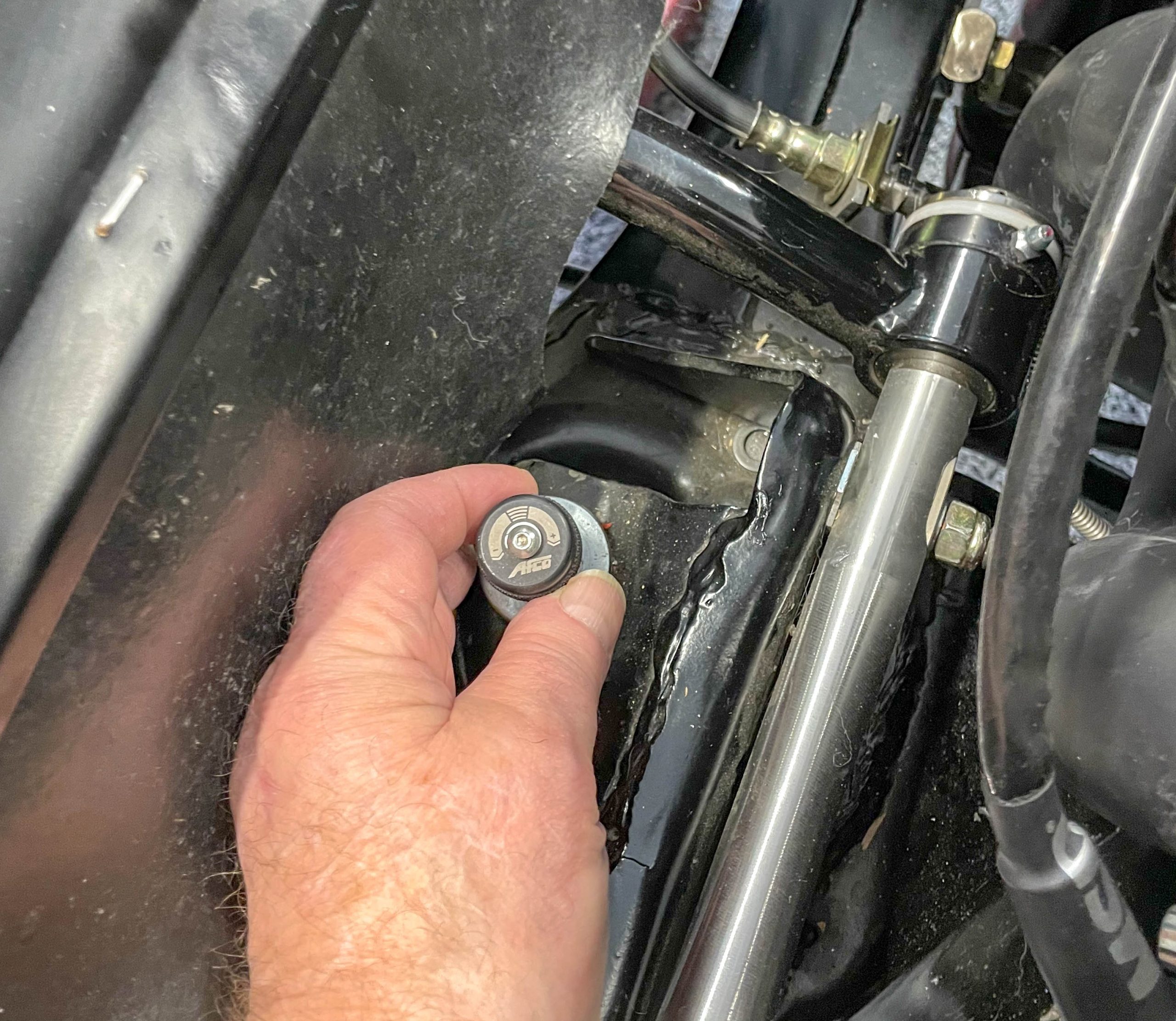 Once in the air, I double checked to ensure the ARB was disconnected. I also double checked to ensure the sway bar bushings were lubricated (mine have a zerk fitting on each bushing). Then I measured from each wheel well lip to the shop floor to establish a baseline “ride height.”