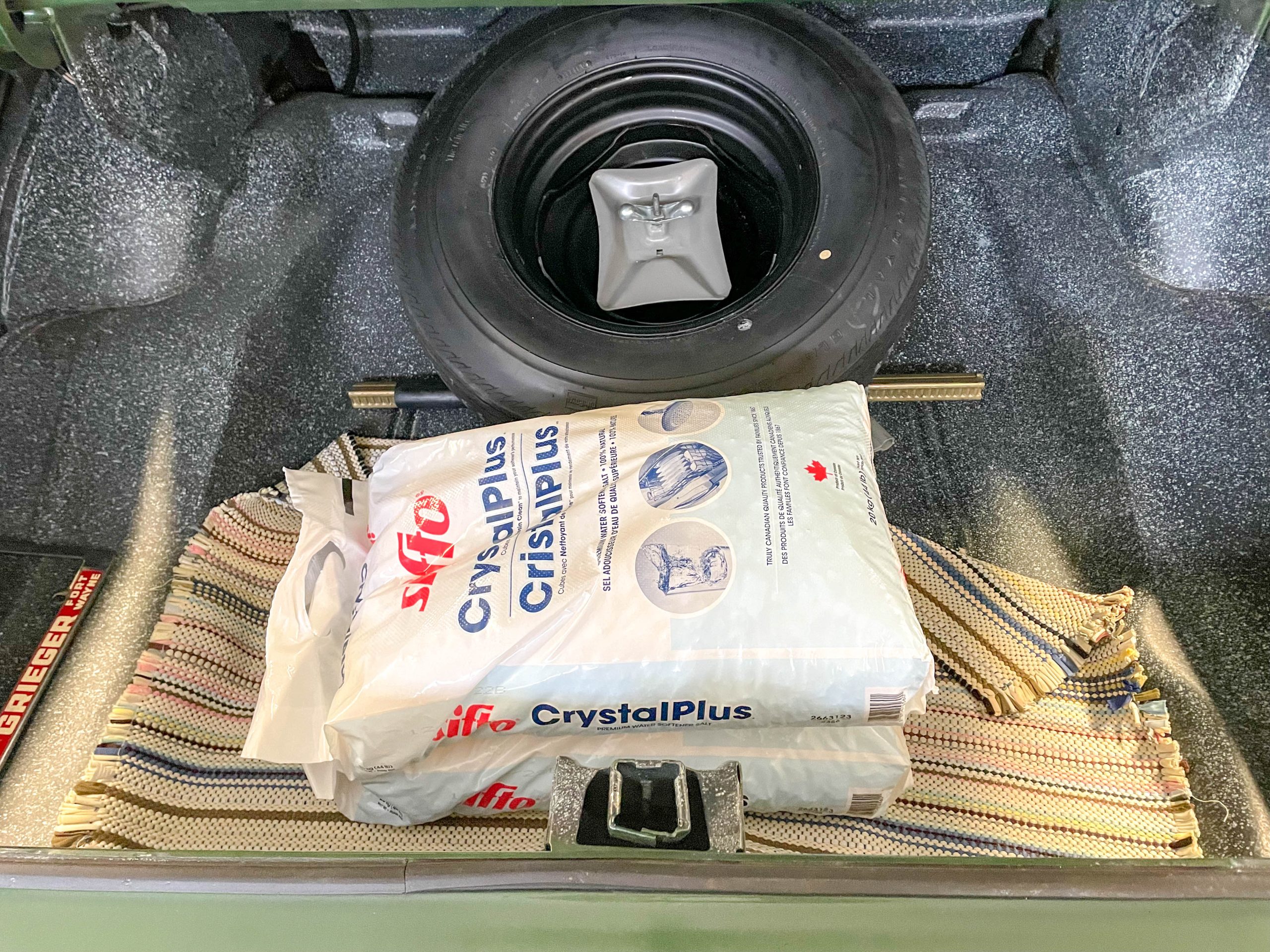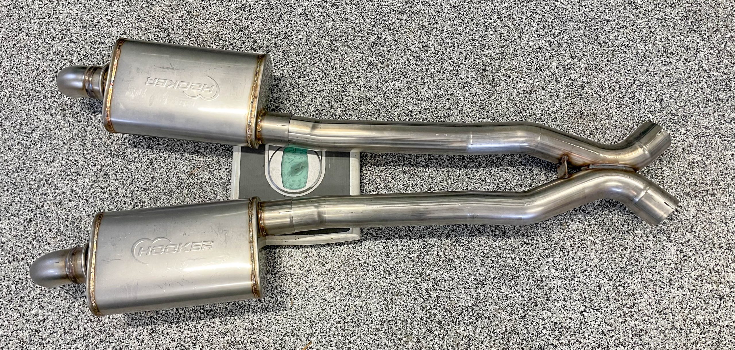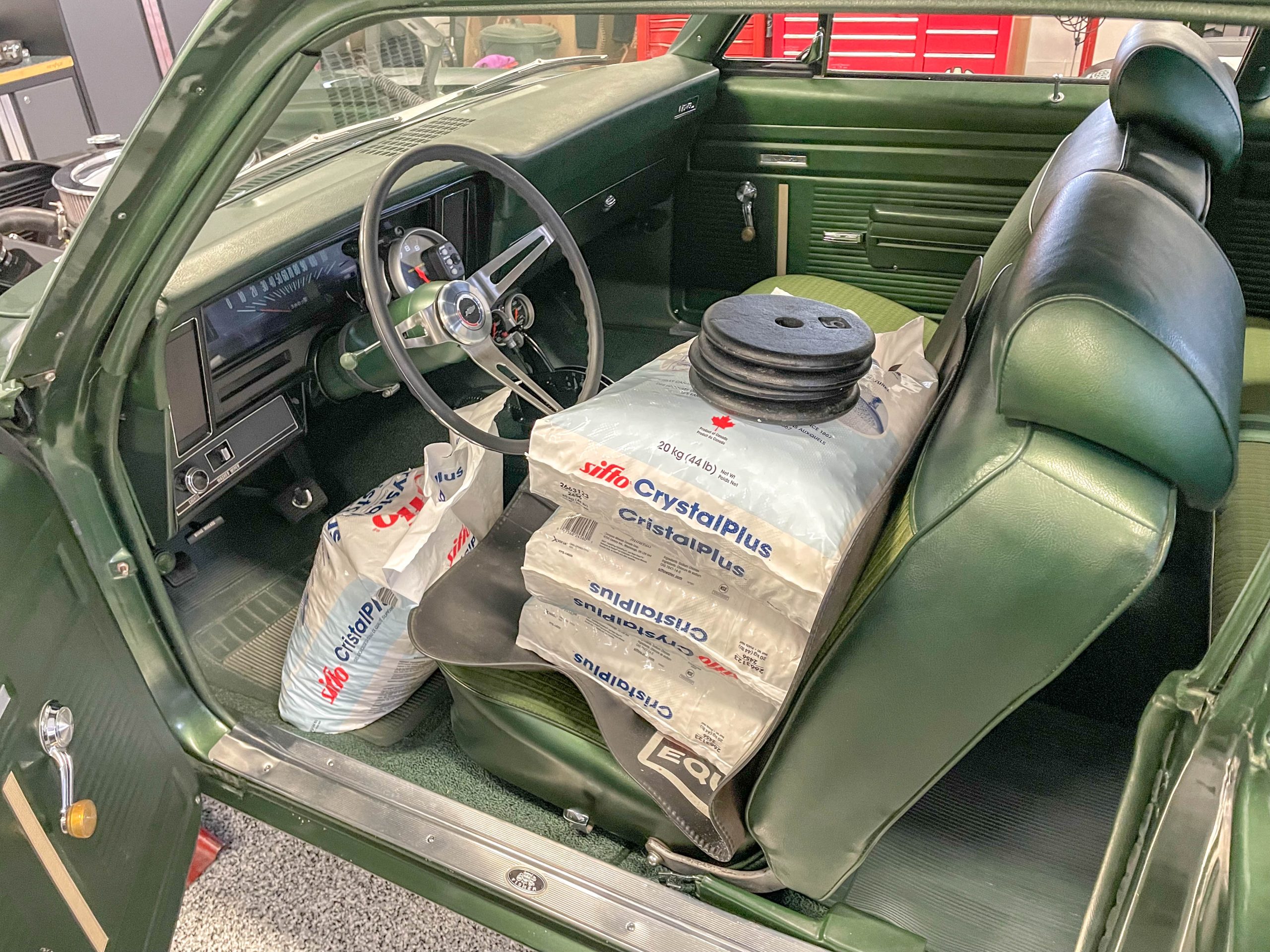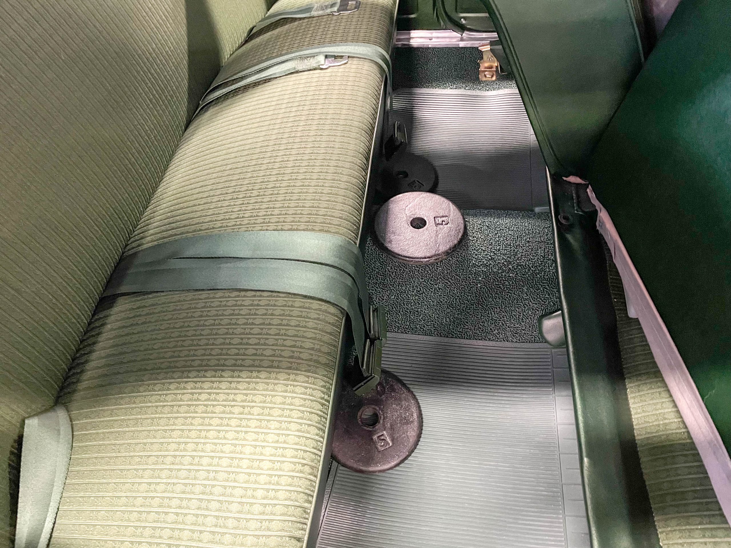 In my case, I placed two bags of softener salt in the center of the trunk to simulate 14 U.S. gallons of gas, 15 pounds of weight across the back seat floor to simulate the exhaust system pieces not attached, and one bag of softener salt on the engine to make up for the missing stock hood. I also placed four bags of softener salt and 20 pounds of extra weight in the driver’s compartment to simulate my body weight. In the end, the idea is to get the car ballasted to simulate true running weight as close as possible.