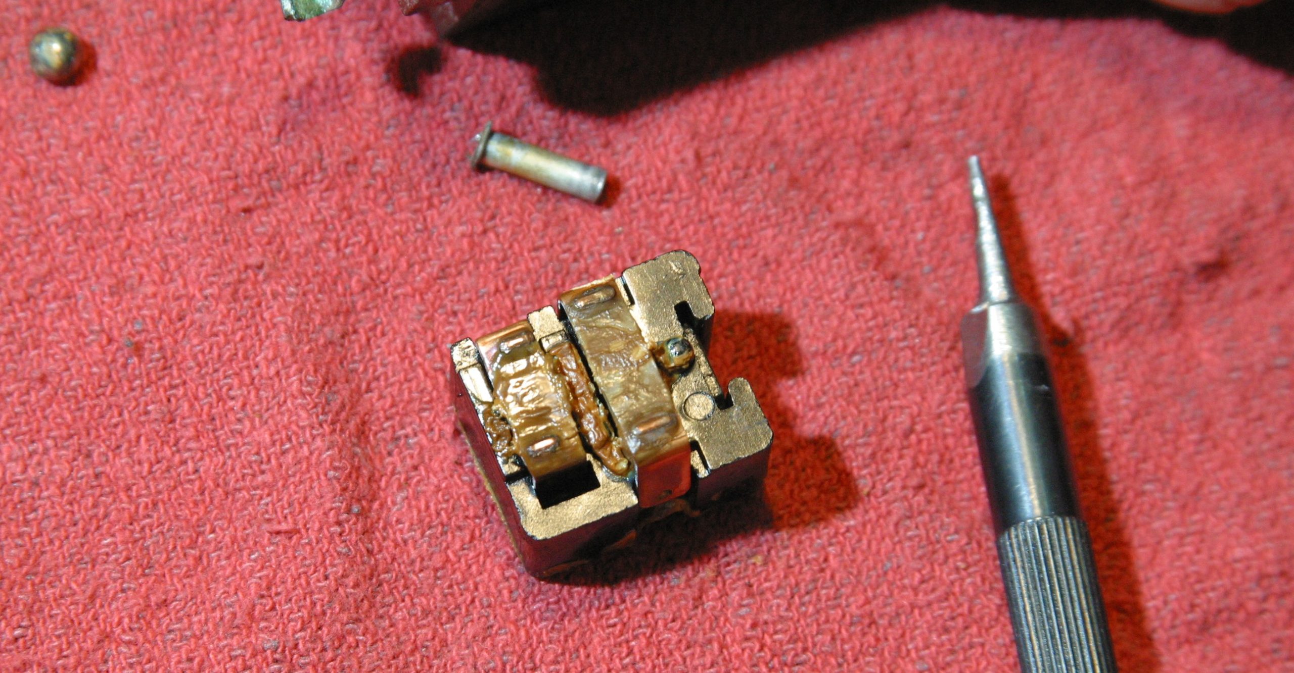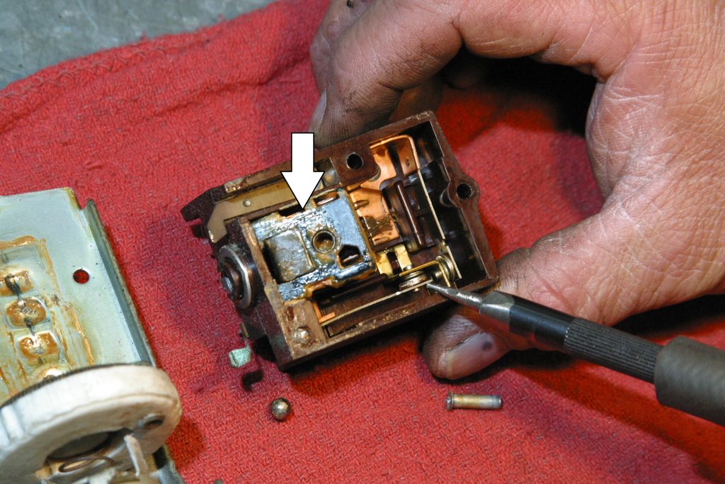 We’re going to look inside a Ford headlight switch, which is very similar to Chrysler’s (same supplier) and quite similar to GM and AMC headlight switches. All are sliding contactor block style where power travels through the contactor to carry power to head, parking, and instrument lights. To get your switch healthy again, clean out the factory lubricant and dress each contact with fine emery paper to remove any corrosion or contaminants. Once you have clean contacts, you can apply the appropriate lubricant to the contactor and contacts and be ready for reassembly.