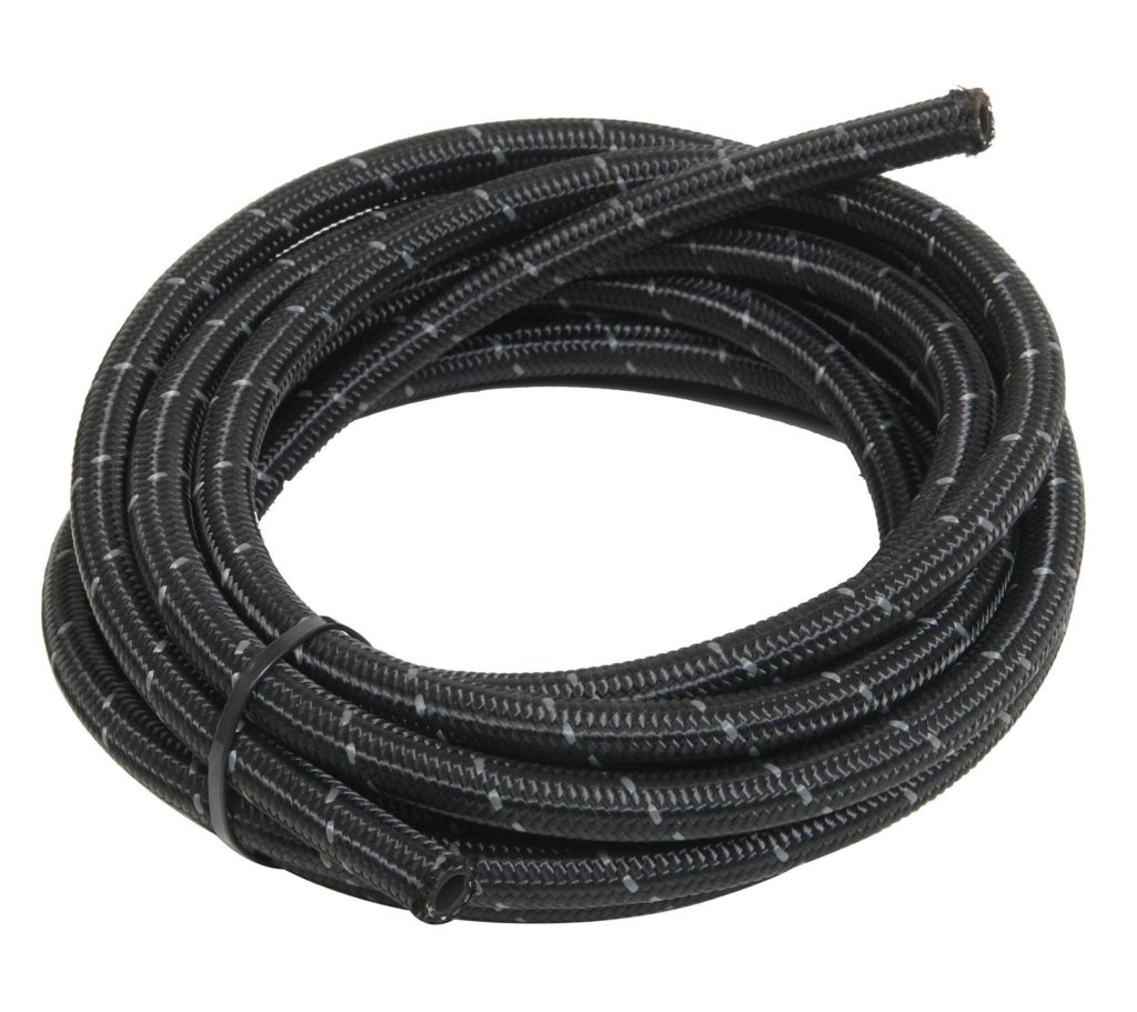 Ryan plumbed the fuel system with -6AN Summit Racing™ Premium Nylon Braided Hose. The hose is lighter than stainless braided hose and features a FKM fluoroelastomer lining to eliminate fuel permeation and a strong braided nylon outer cover. Ryan also used -6AN straight Summit Racing™ Hose Ends and two -6AN to 1/4-inch NPT Summit Racing™ Adapter fittings to connect the hose to the feed and return line fittings on the fuel pump head. (Image/Summit Racing)