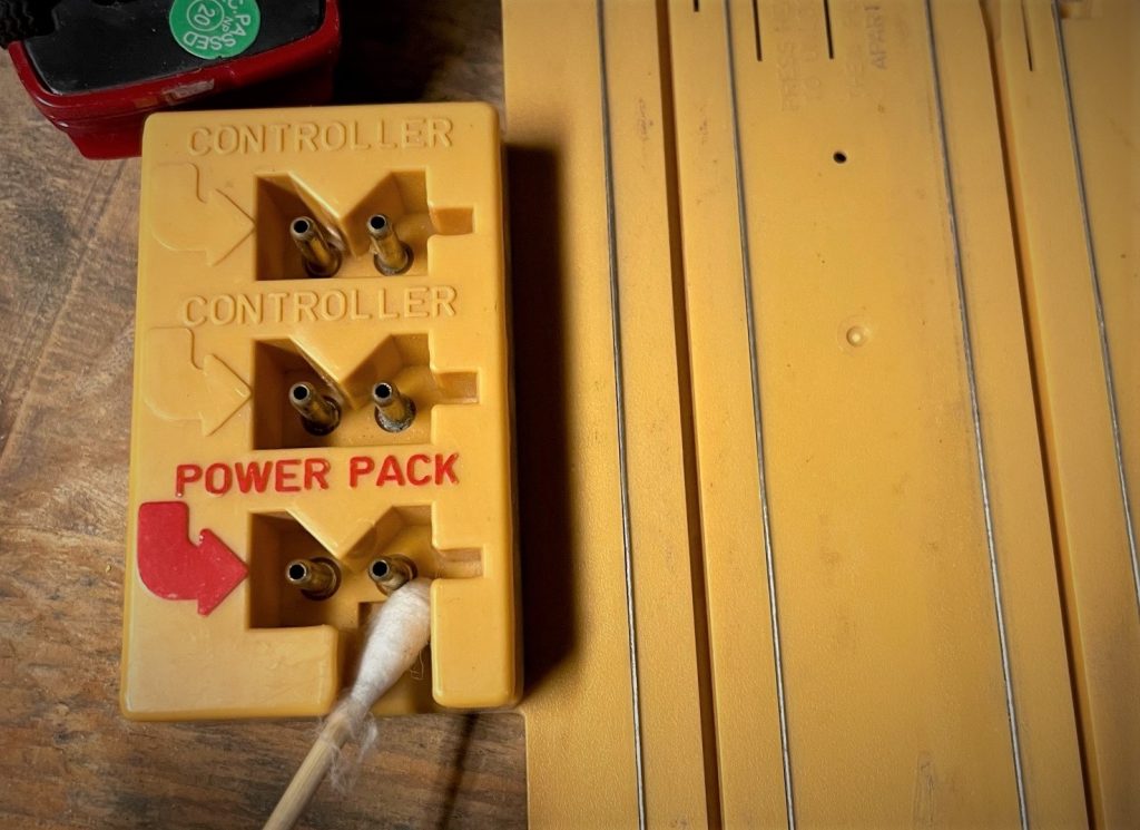 I unhooked each track section and, using a small(!!) amount of electrical contact cleaner and a Q-tip, I cleaned each metal tab of the conductor strip.* Then I pressed the track pieces together to ensure a snug fit.
