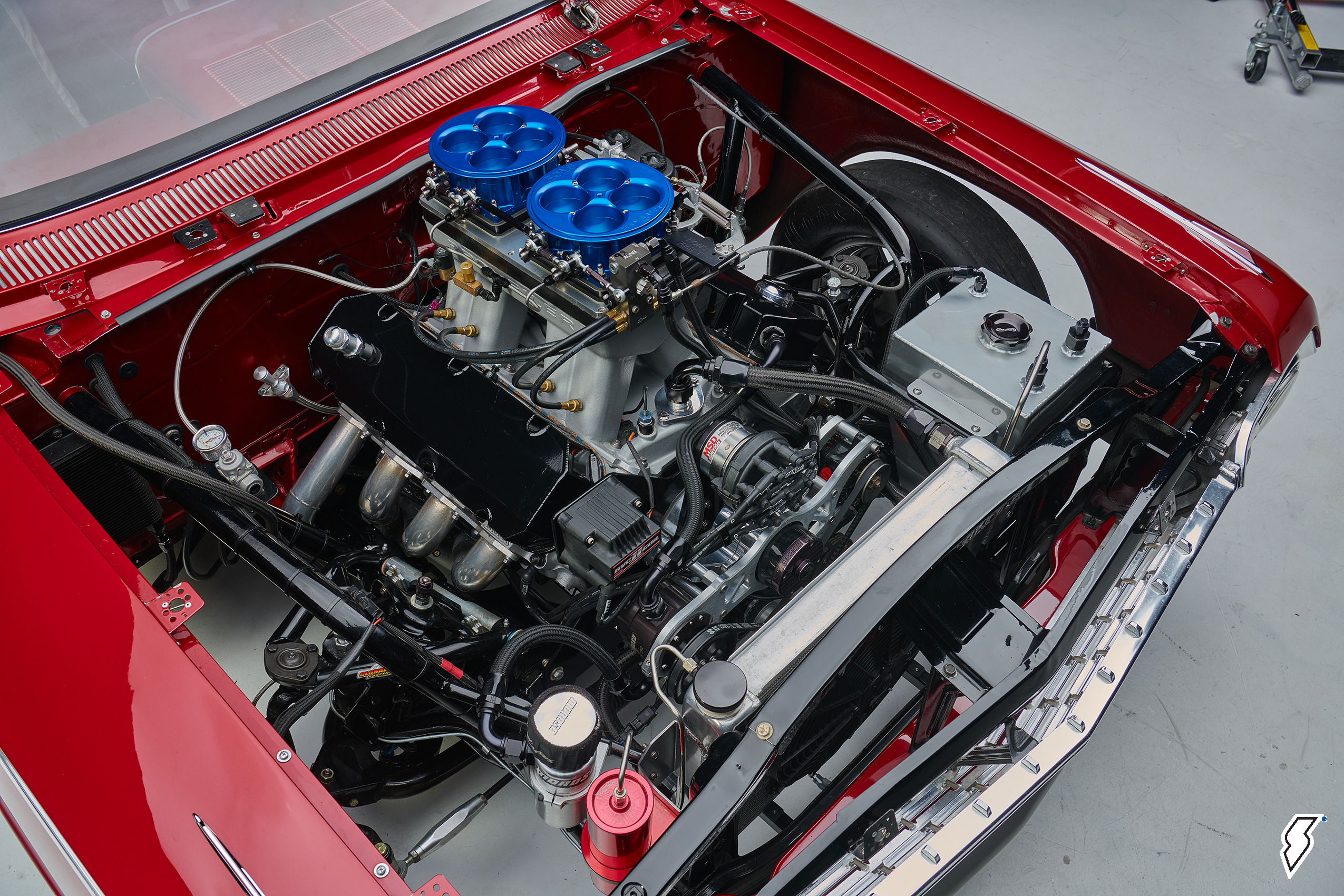 Multiple revisions and endless tweaks have resulted in the Impala’s current configuration: John suggests he’s rebuilt the car three times over. The car has seen three engines, starting with a 476 cubic inch big block Chevy, then a 505. In its current form, the Impala’s engine bay packs a 588-inch Dart Big M Pro Series Chevy big block that inhales through a pair of Holley Terminator throttle bodies and is fed a diet of methanol via a mechanical injection system from Ron’s Fuel Injection. The air/fuel mix flows through a hand-ported Profiler tunnel ram intake into a pair of CNC-ported Brodix Headhunter cylinder heads.