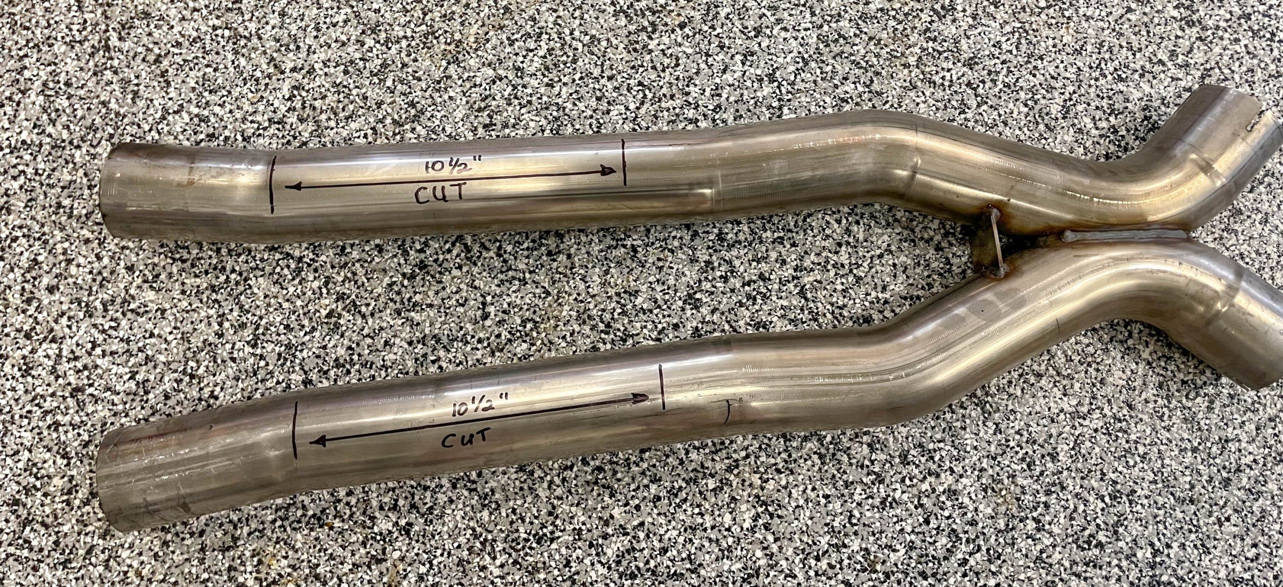 The plan was to add the resonators and cones and then test the system. Muffler swaps are easy enough if it proves necessary. To get there, I pressed the cones into the reducers and marked the mid pipes where the resonators would be spliced into. You’ll note in the accompanying photos the mid pipes are marked so that a section of tubing 10-1/2 inches long will be removed. The resonators are 12 inches long overall. The reason for the 1-1/2 inch discrepancy is due to the fact I wanted a bit more engagement in the slip on reducer (fixing a past miscalculation on my part).