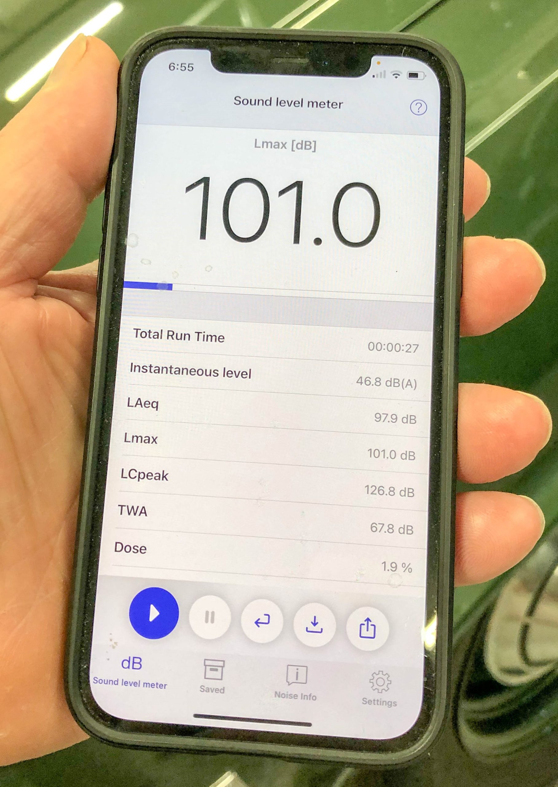 Fair enough. I knew from driving my car that it’s pretty loud. But how loud is loud? I answered that by simply downloading a dB app for my smartphone. As it turns out, these are the numbers I came up with (using the government test procedures), and they’re high: