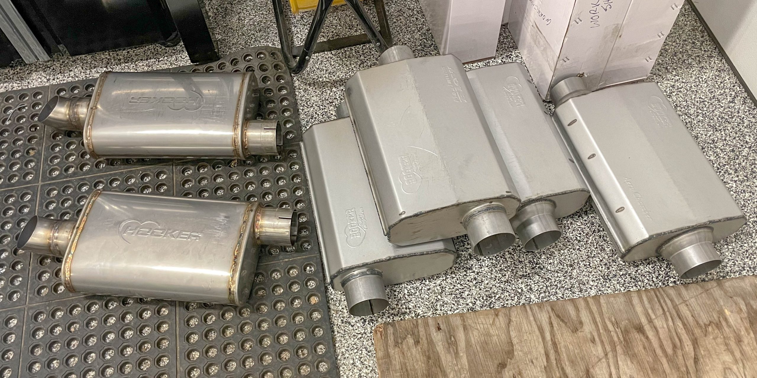 In my parts stash, I had a set of three inch tail pipes with hangers. I also had two other sets of three inch Hooker mufflers. One set was a Hooker Aero Chamber design and the other was a Hooker Maximum Flow configuration. Both are welded steel case mufflers. The VR series mufflers I had in the car are very similar to the Hooker MaxFlows except they’re lighter with a wrapped stainless steel case. The MaxFlow and VR304 mufflers are a straight through perforated core design with fiberglass packing. Testing by others has shown that this Hooker straight through layout is extremely efficient from a performance perspective, and most likely quieter than a chambered setup.