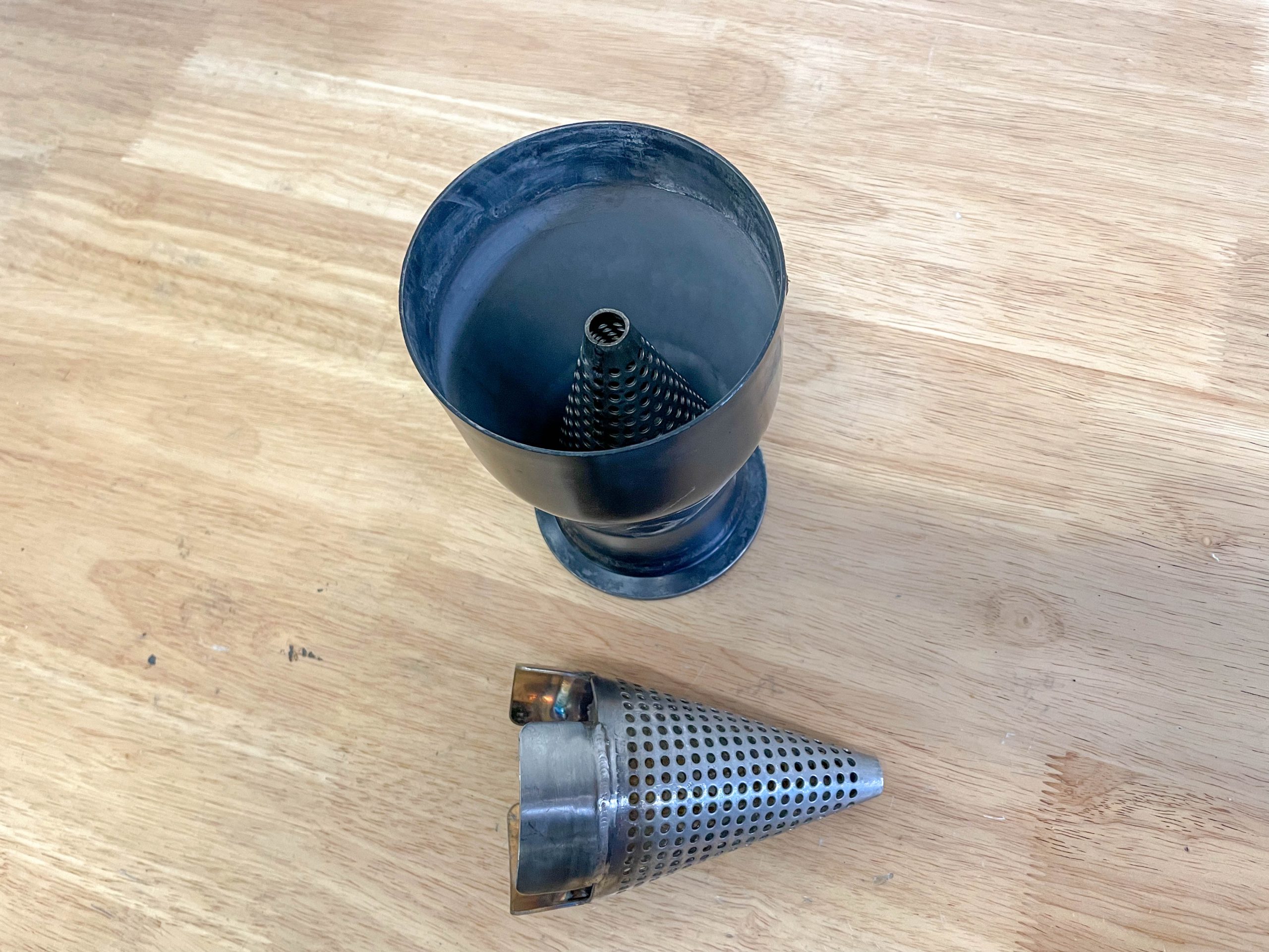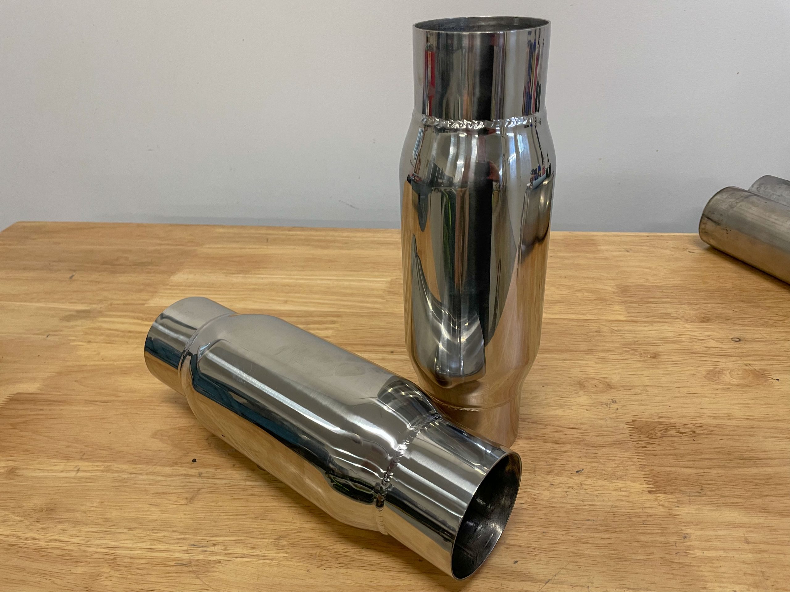 There are a couple of ways to properly install cones. The best location is in the collector or reducer, with the “pointy end” facing the engine. The other option is to install them in the tail pipe (same direction), but they won’t be as effective. The cones I selected were Summit Racing part number SUM-629020. This is a three inch diameter stainless cone that can either be bolted or welded into the pipe. It measures 4-3/4 inches long. I chose to have them welded right into the slip on reducer I was using. The reducer is a four inch down to three inch slip on job that was fitted with a V-band clamp for the exhaust hook up.