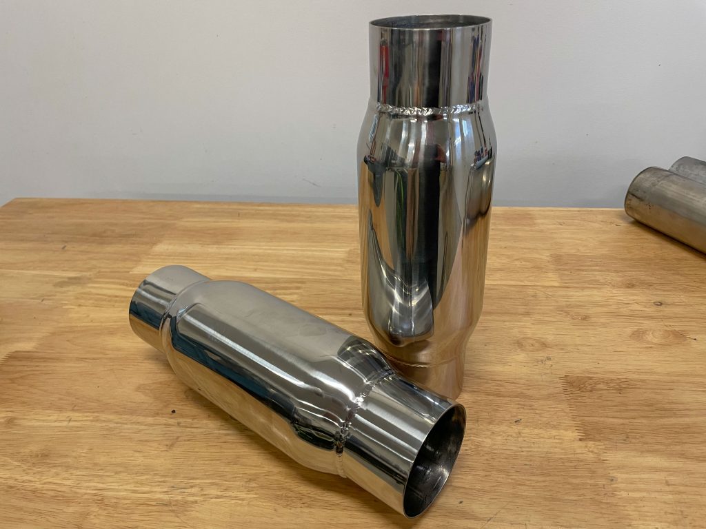 Once again, Summit Racing provided the solution: A set of Vibrant Performance bottle style stainless steel resonators. These resonators have a total length of 12 inches. The diameter is four inches and the actual case measures 9-1/2 inches long. (In particular, the part number for the ones I chose is VPE-1794.)