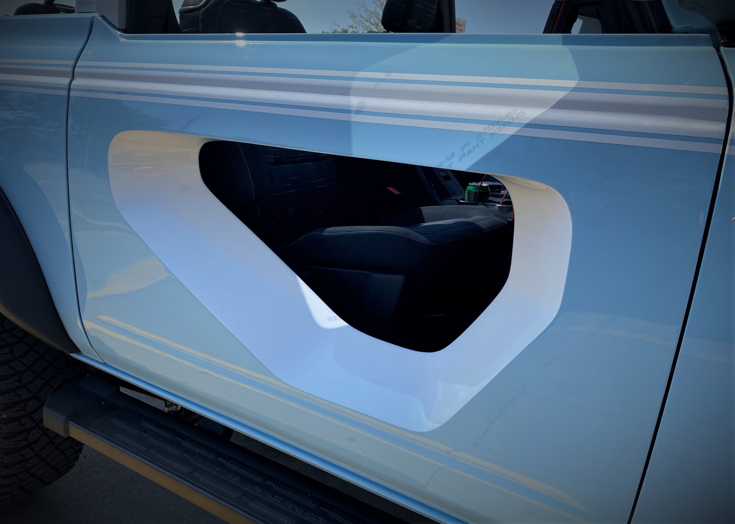 Ford teased us with similar donut door designs early in the Bronco’s pre-release press media, but summarily killed them off as the Bronco reveal date neared. While we’re not 100 percent sure here, those look like the Halo doors made by Anderson Composites and they’re very similar to the unobtanium portal doors from the Blue Oval.
