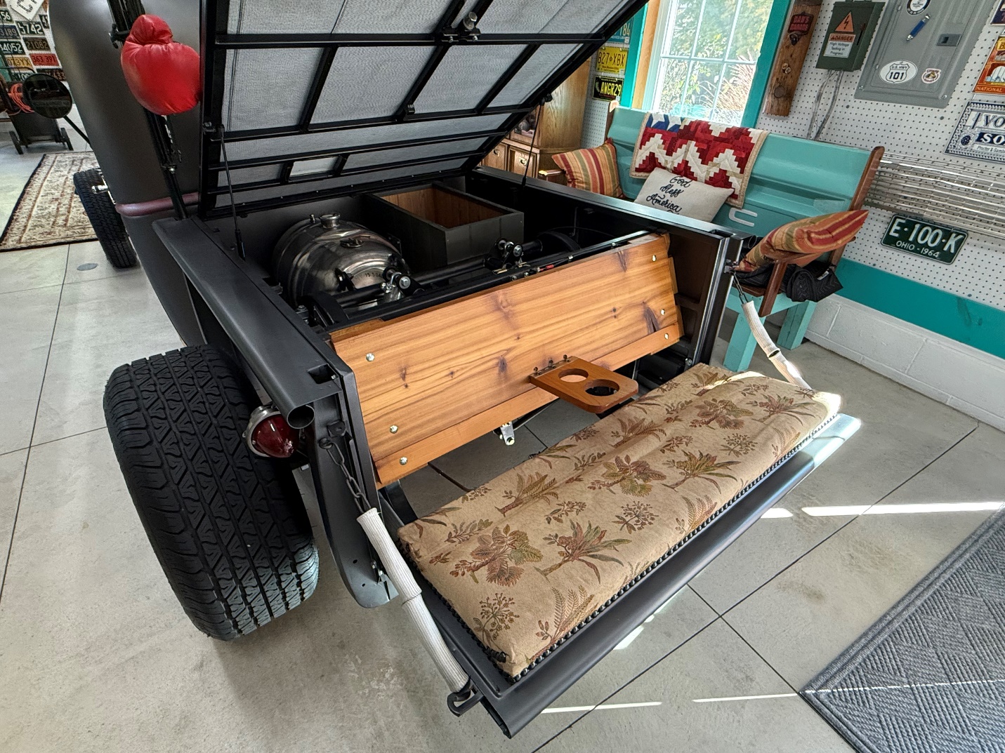 It folds out into a padded bench with integrated cupholders—for literal “bench racing” of course. The bed features a fold-down tonneau cover, while an antique beer keg serves as the fuel cell.