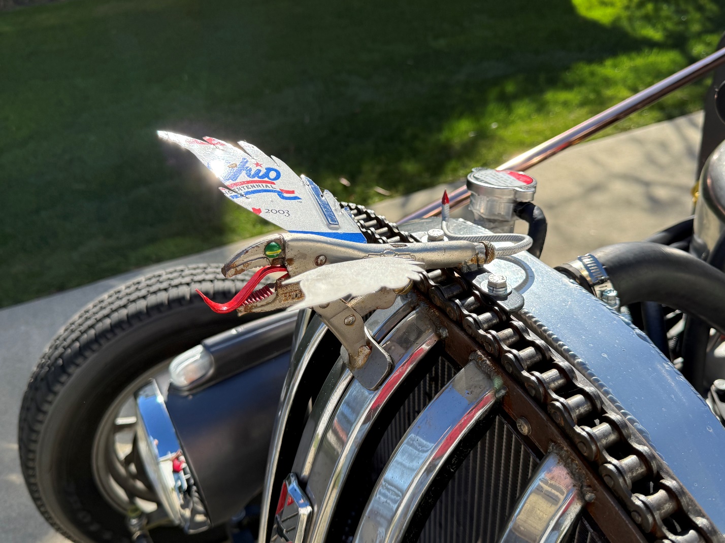 Don started with a pair of locking pliers and, together with a retired license plate and some braided hose, he transformed the whole thing into an impressively recycled dragon sculpture.