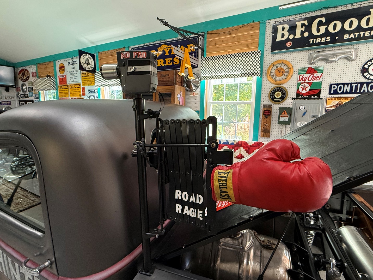 If a spring loaded boxing glove doesn’t work as a deterrent, a “No Pro” vintage film camera is constantly on guard, watching over the impeccably-built hot rod.