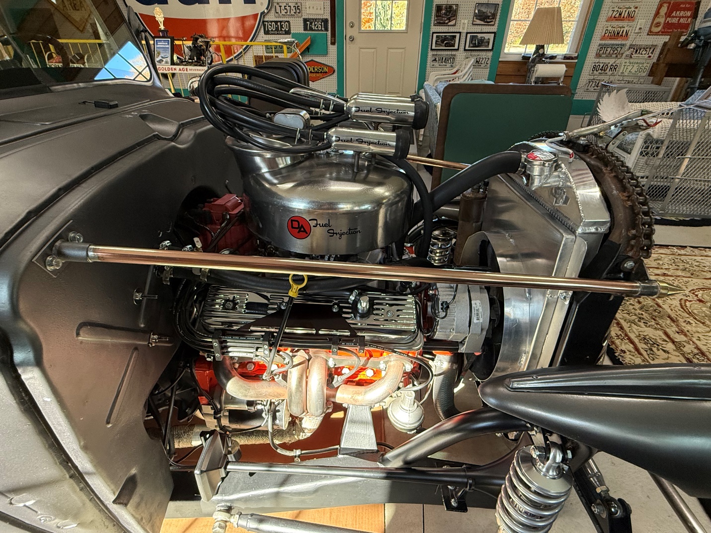 Perhaps my favorite highlight on the truck is the custom “DA fuel injection” on the 350 Chevy small block engine.