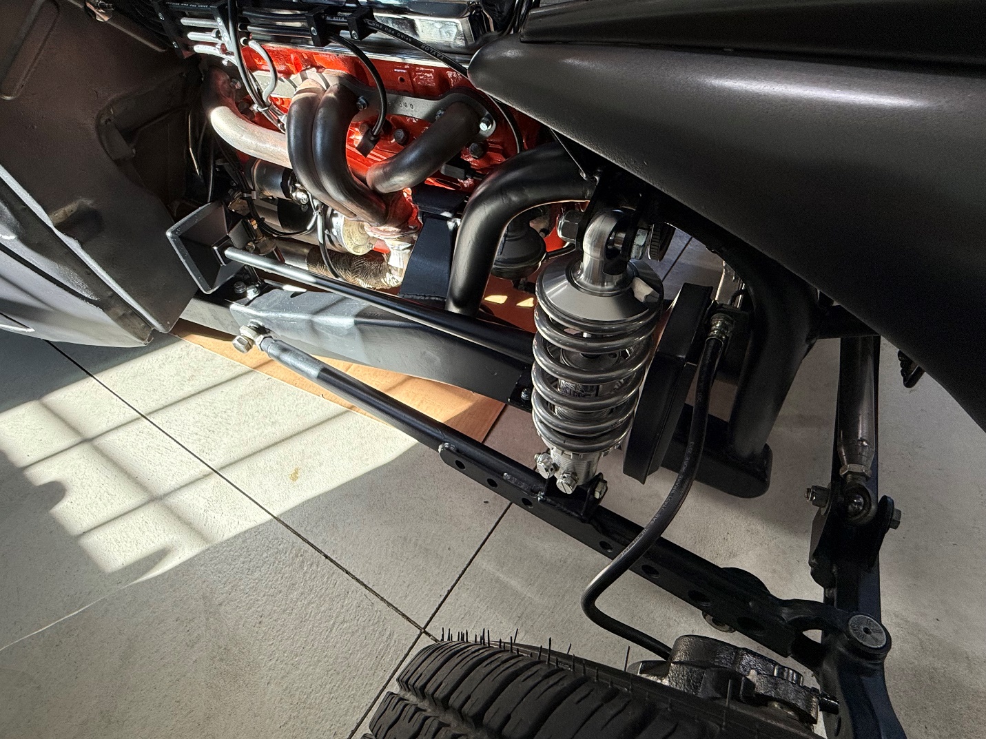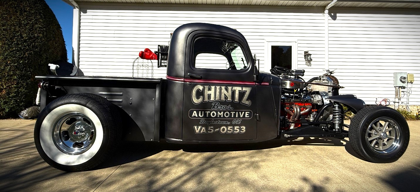 Don started with a truck cab that he found in North Dakota, which was then summarily plunked down onto a custom-made frame built by a Patrick Myers in Terre Haute, Indiana. The frame features a coilover suspension and a Watts four-link out back..