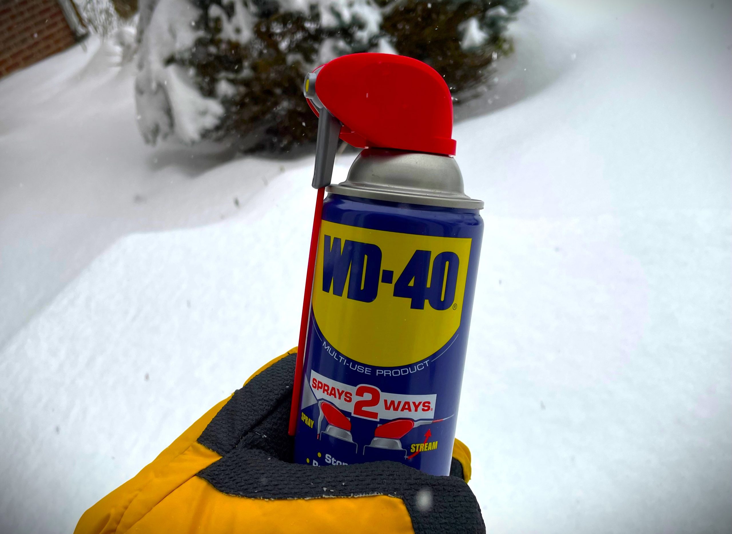 Fun Fact: Did you know the “WD” stands for “Water Displacement”? That’s a fancy way of saying that ice won’t build up on spots where you’ve sprayed it. In other words, a quick shot of WD-40 into your lock mechanisms and door latches can save you a ton of headaches when it comes to opening your doors. In our experience, a single quick spray will easily last a full season. We’ve had similar results with silicone spray lubricants too.