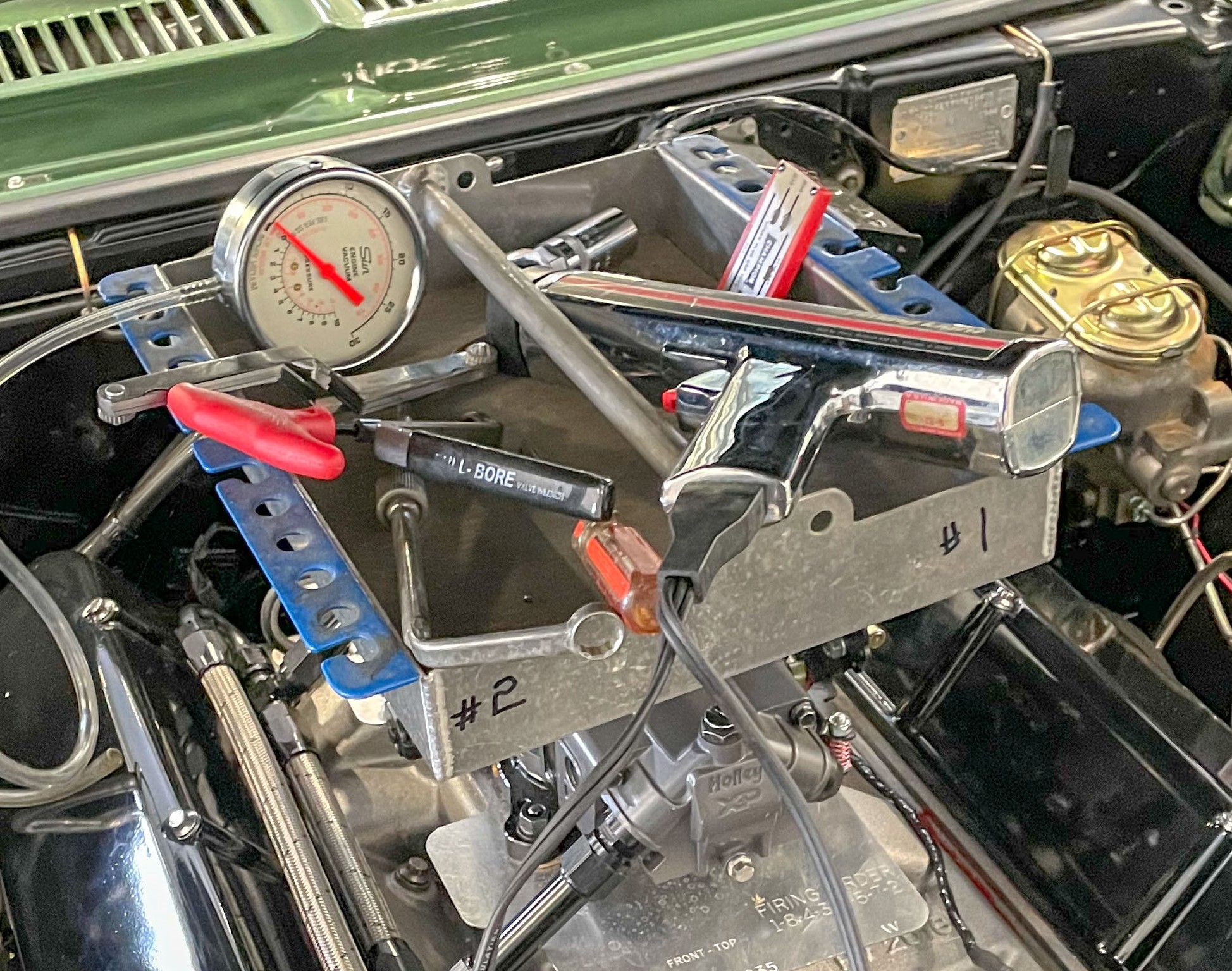 For a car with a carbureted engine, bring a timing light and a distributor wrench. The car might respond to timing changes depending on conditions. The same goes for carburetor tuning. For example, the carb might need to be rejetted or you may need to work with accelerator pump cams and shooters to offset a stumble. Bring a vacuum gauge, jets, and power valves too.
