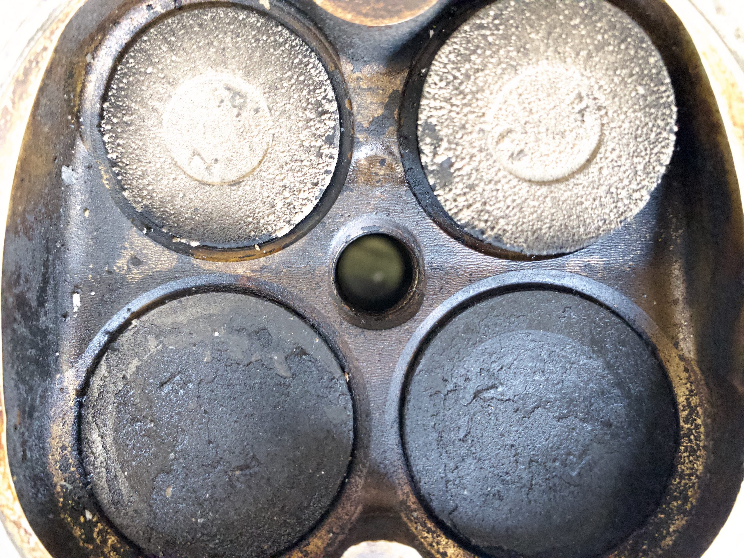 Kyle also checks the visible water passages on the head, as these can corrode if the engine is left sitting for long periods of time, or the coolant (which, like some people, becomes acidic with age) is not changed on schedule. This can also be addressed with TIG welding, at least on the mating surfaces. Our head looks fine—unlike this one…