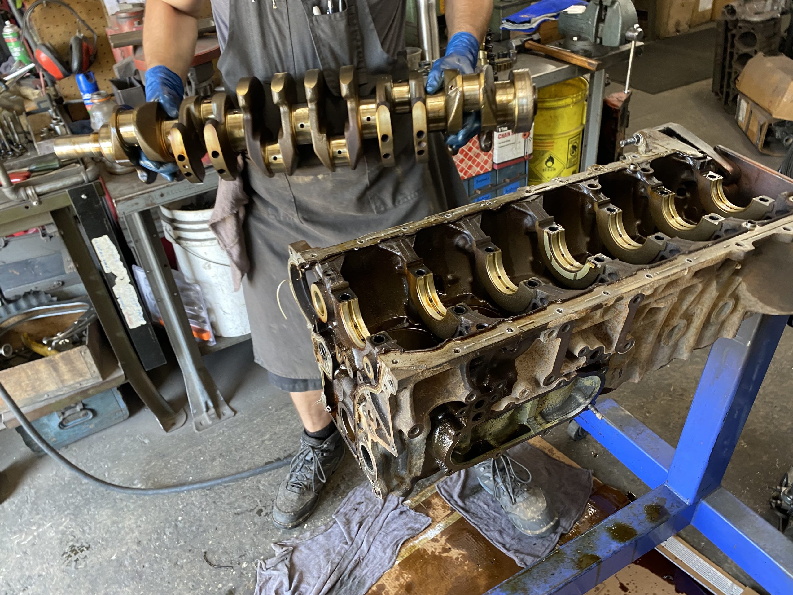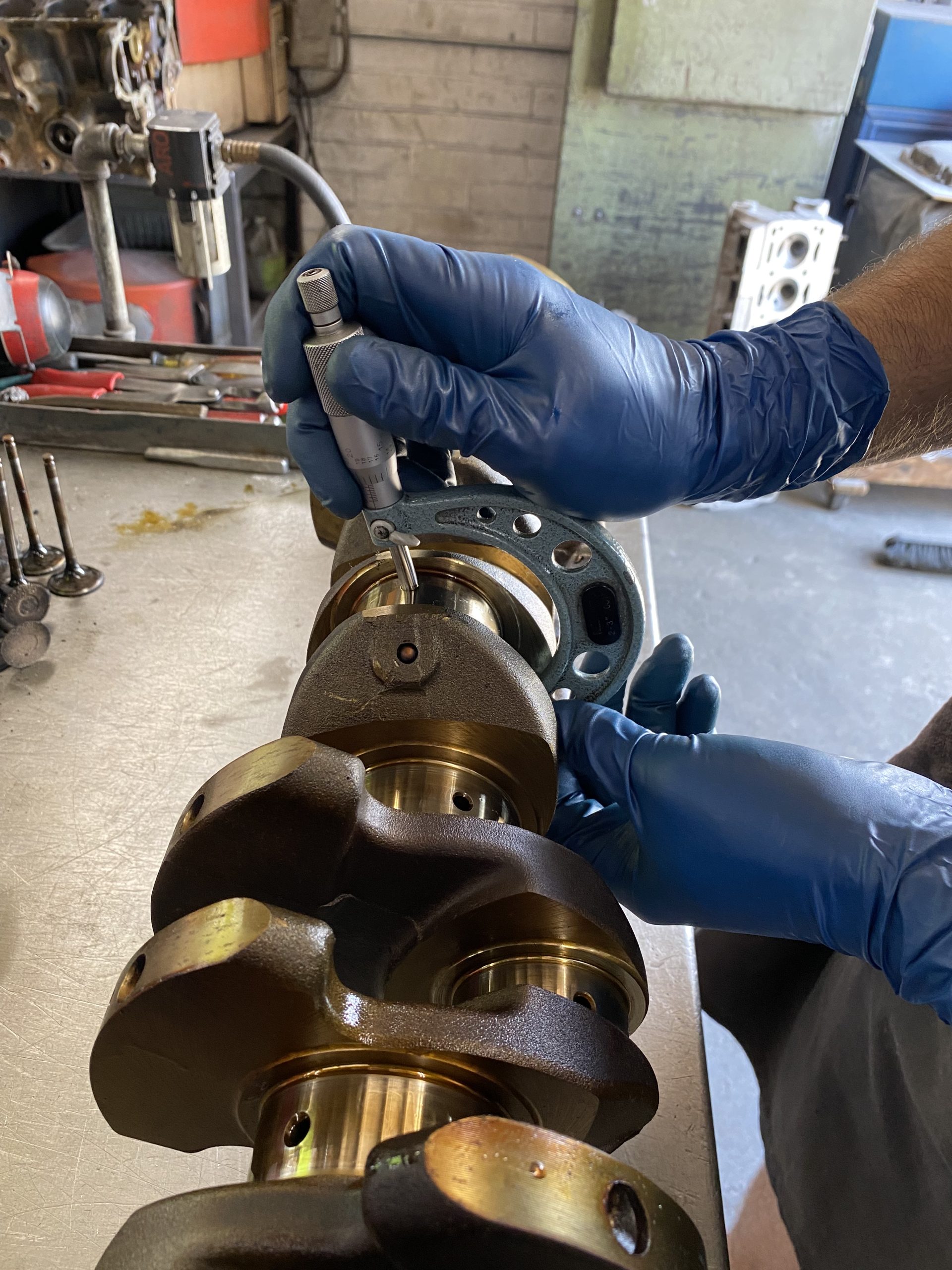 The thrust washers come out, repeat after us: normal wear. The mains come off, and Kyle pumps iron with the crank, then measures the journals—which are dead-center on the spec range.