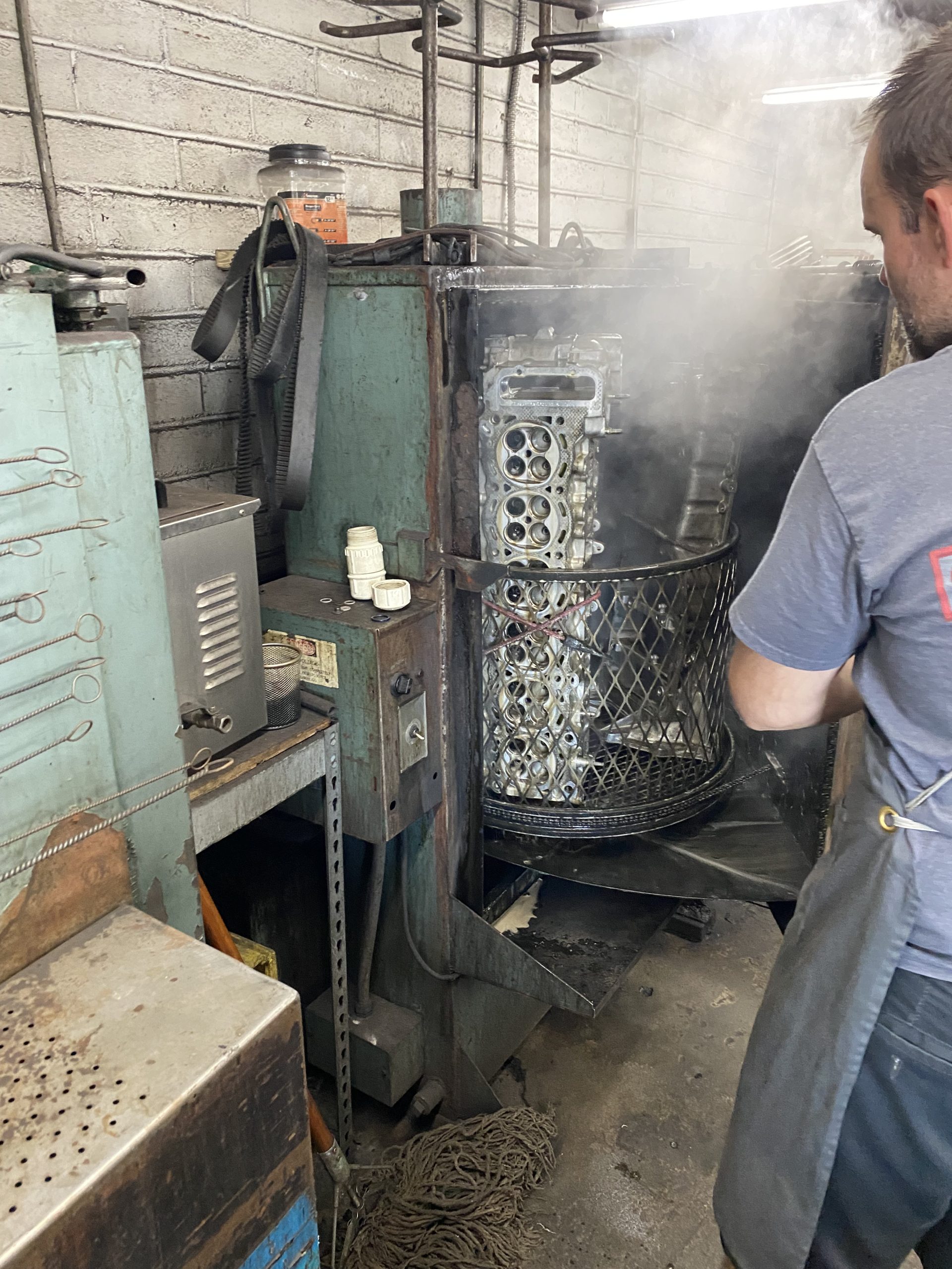 The first parts come out of the Jet-Spray for power-rinse and drying. They look almost new already, but Kyle’s not happy, so they’ll be washed again later.
