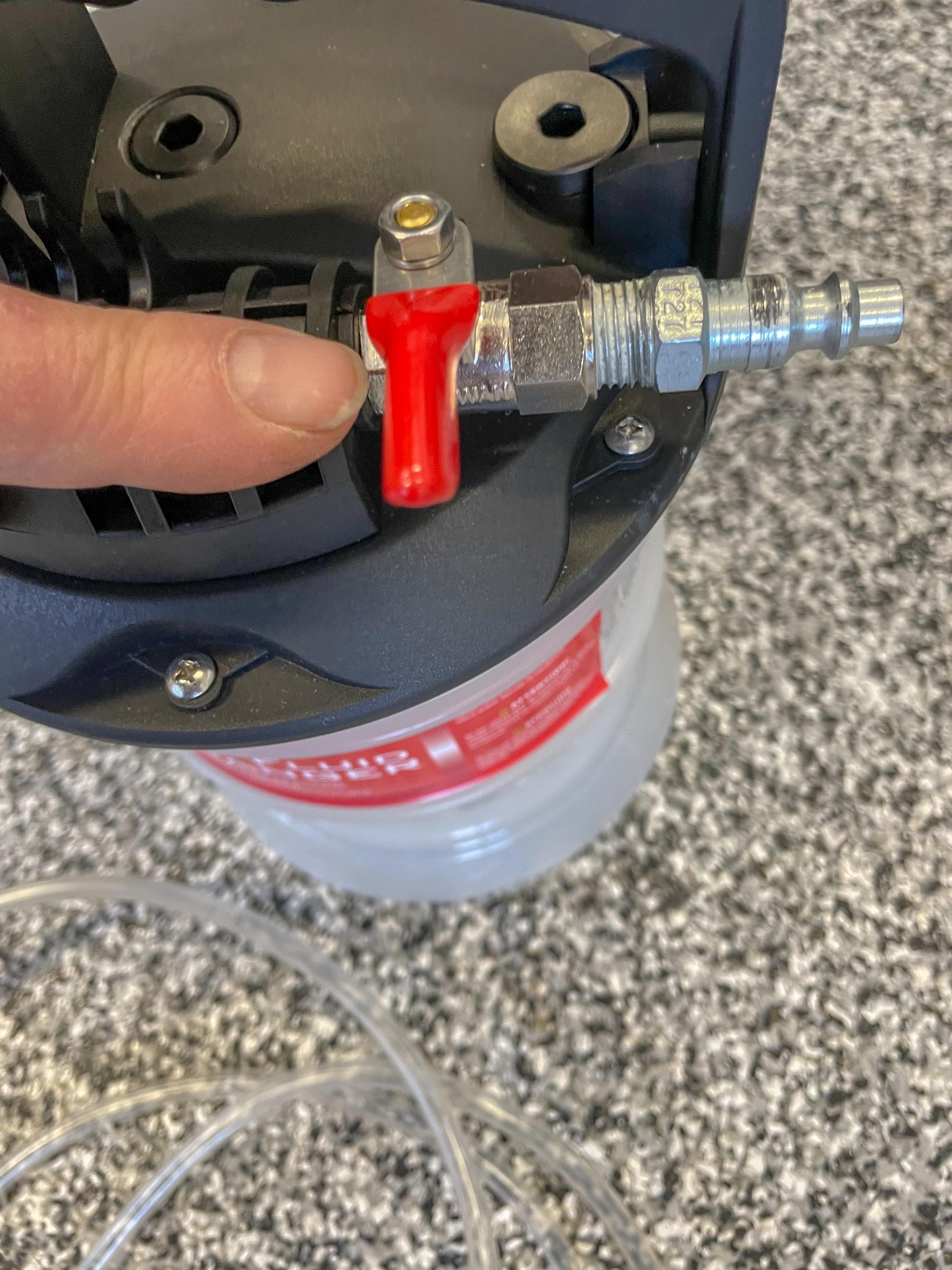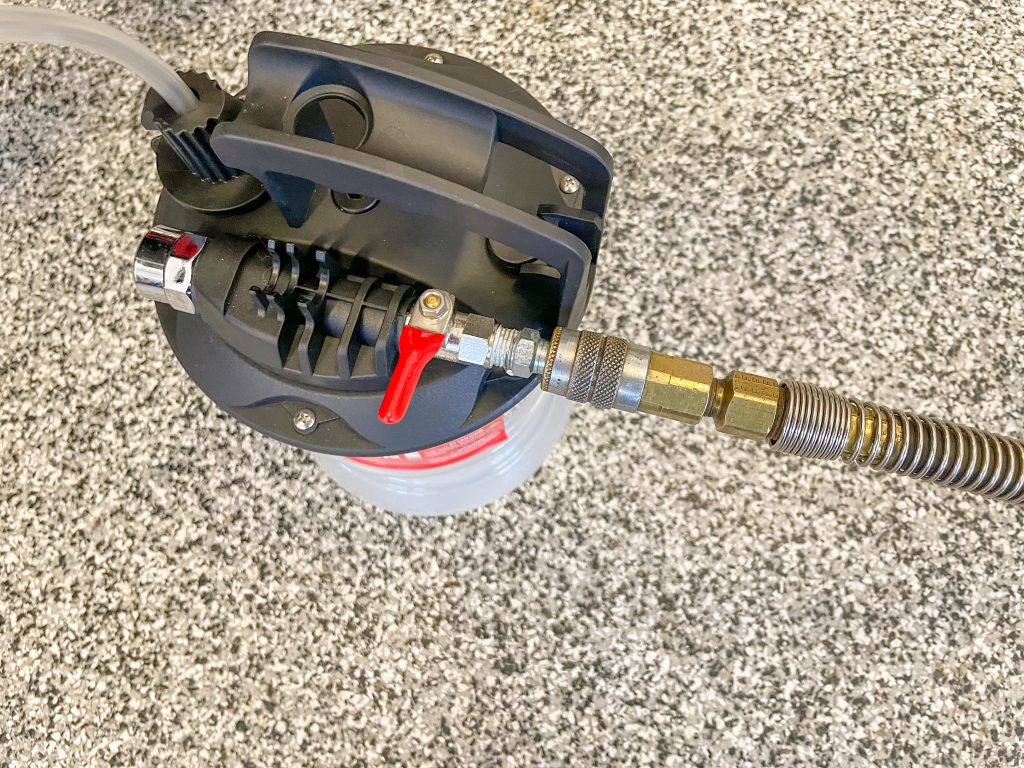 Make sure the air valve lever on the exchanger’s reservoir is in the closed position. Connect the air compressor hose to the quick coupler, then open the air valve. The unit will automatically start to extract the brake fluid once the bleeder screw is cracked open.
