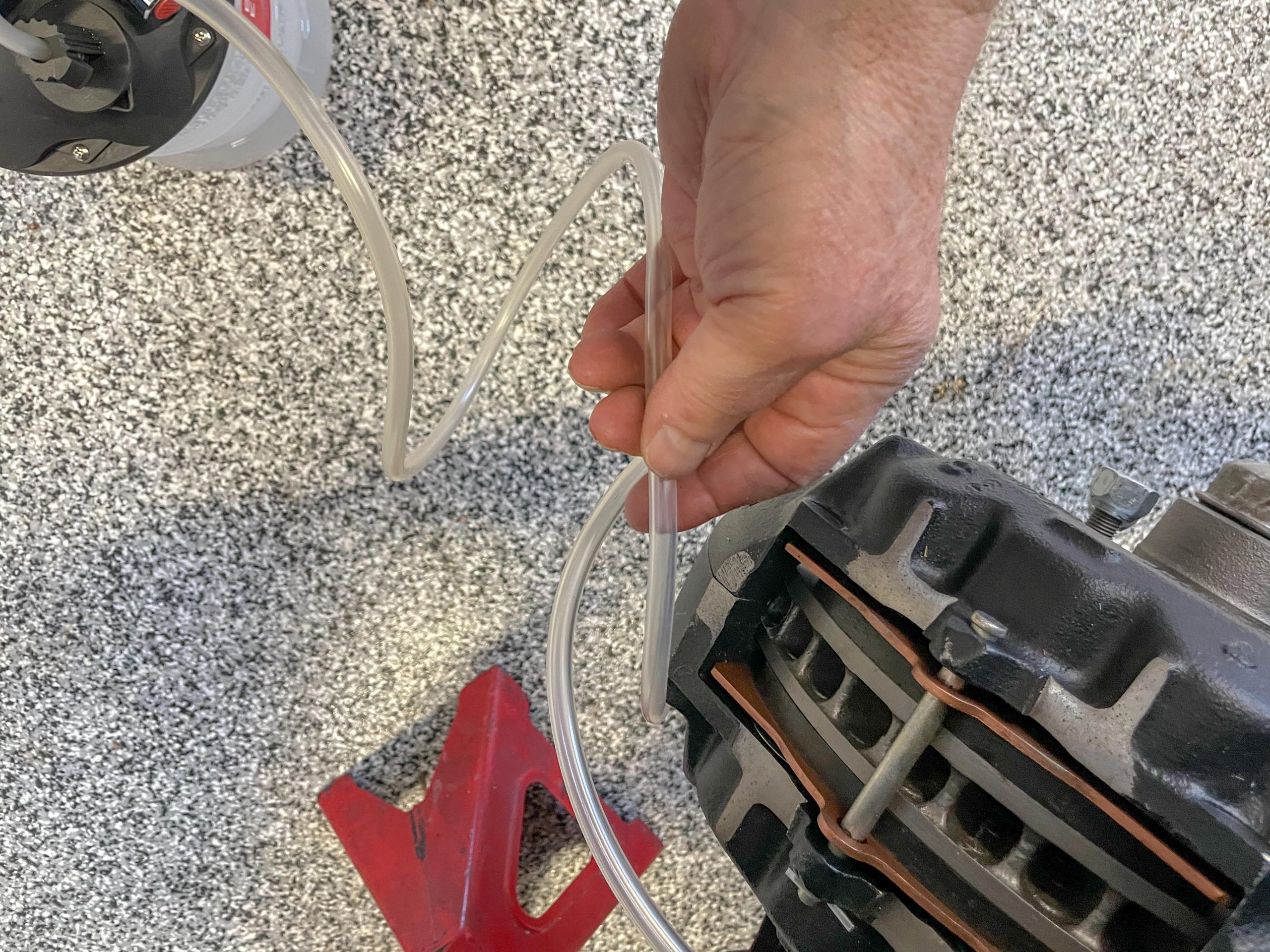 Start the process at the wheel cylinder or caliper furthest from master cylinder. Normally this would be the right rear. Put a brake bleeder wrench over the flats on the bleeder screw, then push the end of the clear plastic evacuator tube onto the bleeder screw nipple.