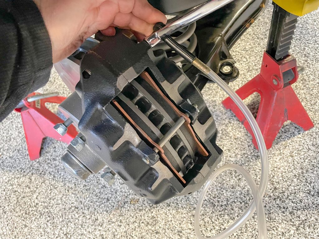 Close the bleeder screw. Remove the plastic hose at the bleeder screw and remove the bleeder screw wrench.
