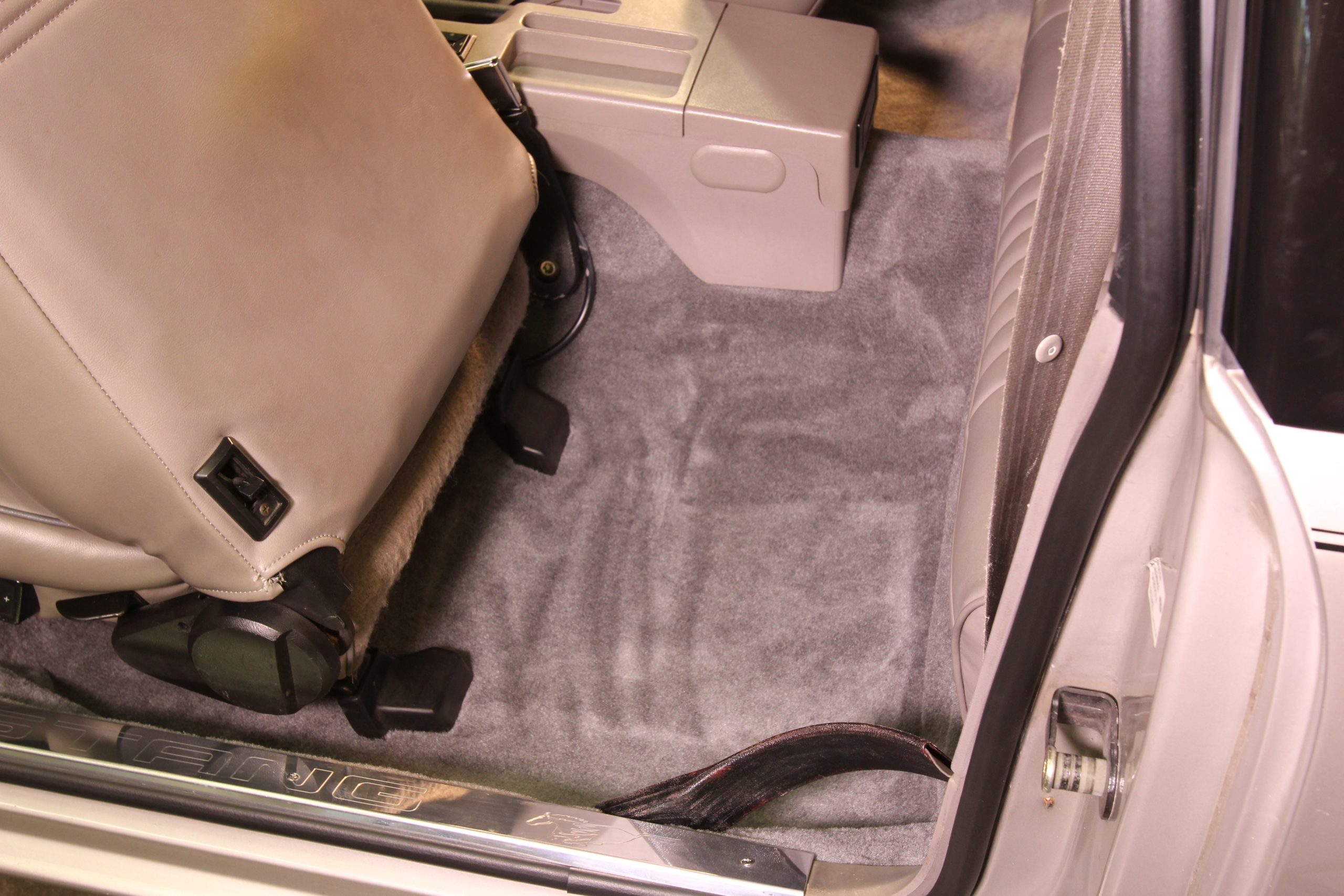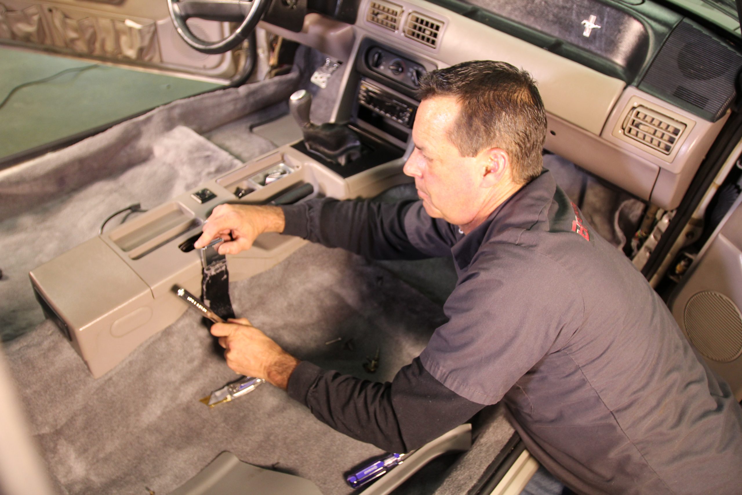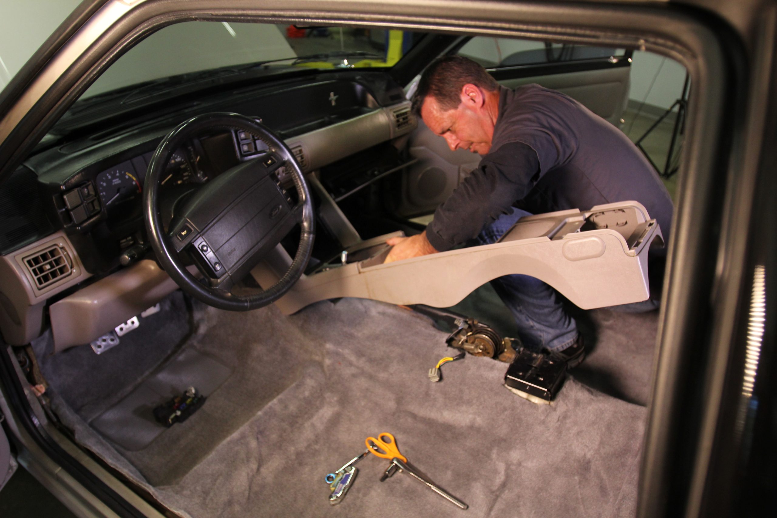 Installation of a new carpet is easier than you think. For not a whole lot of money, you can restore the appearance of your Ford Mustang’s interior in just a few hours. (Image/Evan Smith)This 5.0 LX suffered from a tear in the front and stains in the back. (Image/Evan Smith)(Image/Evan Smith)We disconnected the negative cable (so the dome light wouldn’t drain the battery), and we removed the new carpet from the packaging. (Image/Evan Smith)We then removed the rocker sill plates. (Image/Evan Smith)Followed by the kick panels. (Image/Evan Smith)Next, we removed the front seats. Note: If your car is equipped with power lumbar, undo the connector (located under the driver’s seat) and carefully remove the seats. (Image/Evan Smith)With the seats out of the way, we unbolted the seat belts where they attach to the floor. (Image/Evan Smith)Next, we unscrewed the shifter knob and popped off the shifter boot bezel and the boot itself. (Image/Evan Smith)With the top of the console free, we disconnected the electrical supply to the 12-volt power source, and to the power window switch. (Image/Evan Smith)Then we removed the heater control bezel, the radio, and the remaining screws that retain the console. (Image/Evan Smith)This allowed us to remove the console and mounting bracket. (Image/Evan Smith)We then pulled out the rear seat cushion, which pops out of the mounting clips. (Image/Evan Smith)Following this we removed the old, nasty rug. If you’re doing this at home, don’t chuck the rug in the garbage just yet—you’ll need to use it as a template for marking holes that you’ll cut in your new carpet. (Image/Evan Smith)Here’s the old factory rug with the new ACC carpet. (Image/Evan Smith)We recommend using a heat gun to help mold the carpet into shape. Remember, it was rolled up in a box, so it needs to relax and take shape to make installation easier. Leaving it in the sun to warm up is another trick. (Image/Evan Smith)Next, lay your old carpet over the new one, then mark and cut the holes for the shifter and emergency brake handle. We recommend cutting small holes first and then trim the carpet to fit once it’s in the car. (Image/Evan Smith)Now you’ll be ready to install your new carpet. We slid the ACC carpet into our LX and fed the shifter handle and parking brake through the holes we previously made. We then formed the carpet to the shape of the floor. It was slightly wrinkled at first, but it smoothed out as it settled into place. (Image/Evan Smith)Next we trimmed the carpet to fit tightly around the shifter and the console mounting bracket. (Image/Evan Smith)Then we installed the outer seat belts to keep the carpet in place. (Image/Evan Smith)Working from the center of the carpet on out, we reinstalled the console base and mounting hardware, along with the lower portion of the instrument panel. (Image/Evan Smith)Then we slid the shifter boot over the handle, along with the shifter bezel and the shifter knob. (Image/Evan Smith)We then popped the heater control bezel into place. (Image/Evan Smith)Here, we installed the seatbelts. (Image/Evan Smith)With the carpet nice and tight, we screwed in the passenger rocker sill plate and installed the passenger seat. Following this, we reconnected the fuel pump relay and bracket. Then came the kick panels along with the driver’s side sill plate. (Image/Evan Smith)Followed by the driver’s seat. (Image/Evan Smith)Lastly, we put the rear seat in the Mustang. (Image/Evan Smith)We hit it with a vacuum and began enjoying the stunning good looks of our new ACC carpet. (Image/Evan Smith)The completed project brought the interior alive! (Image/Evan Smith)(Image/Evan Smith)
