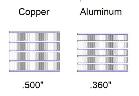 Aluminum radiators are more efficient because they have more tube-to-fin contact surface area than an identically sized copper-brass radiator. Part of this is due to the fact that aluminum radiators have fins that are wider, closer together, and shorter in height. This results in more layers in the same given space. A two-row aluminum radiator can reject more heat than a copper-brass radiator of similar size made with four rows of tubes.