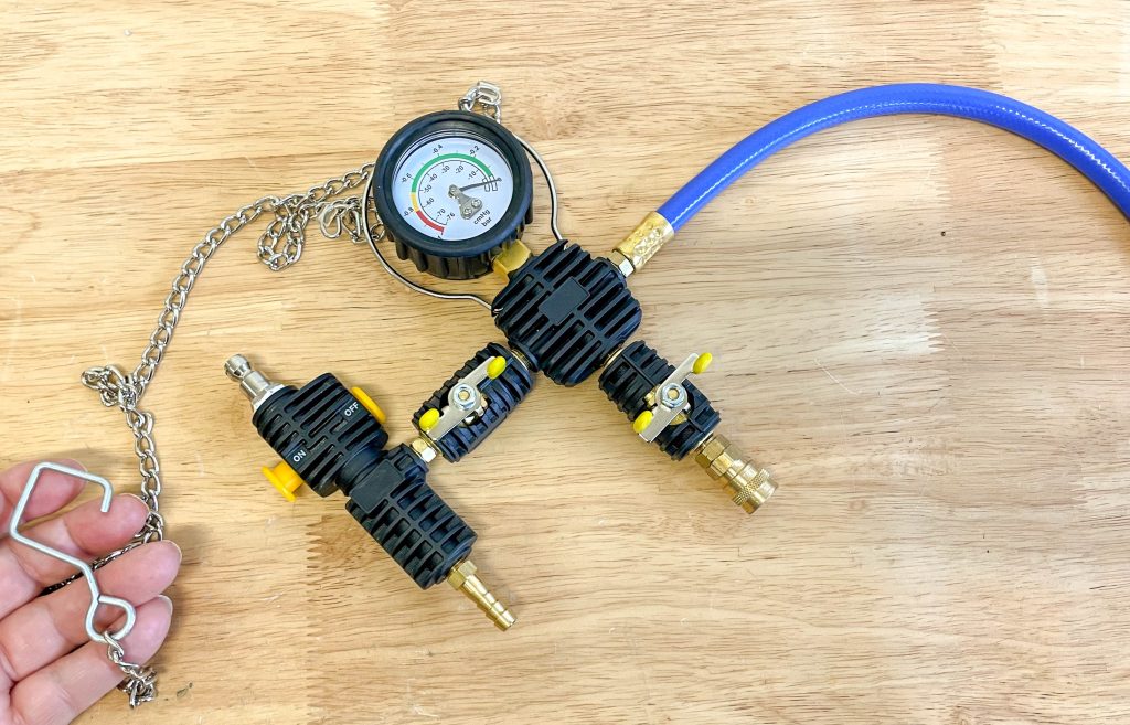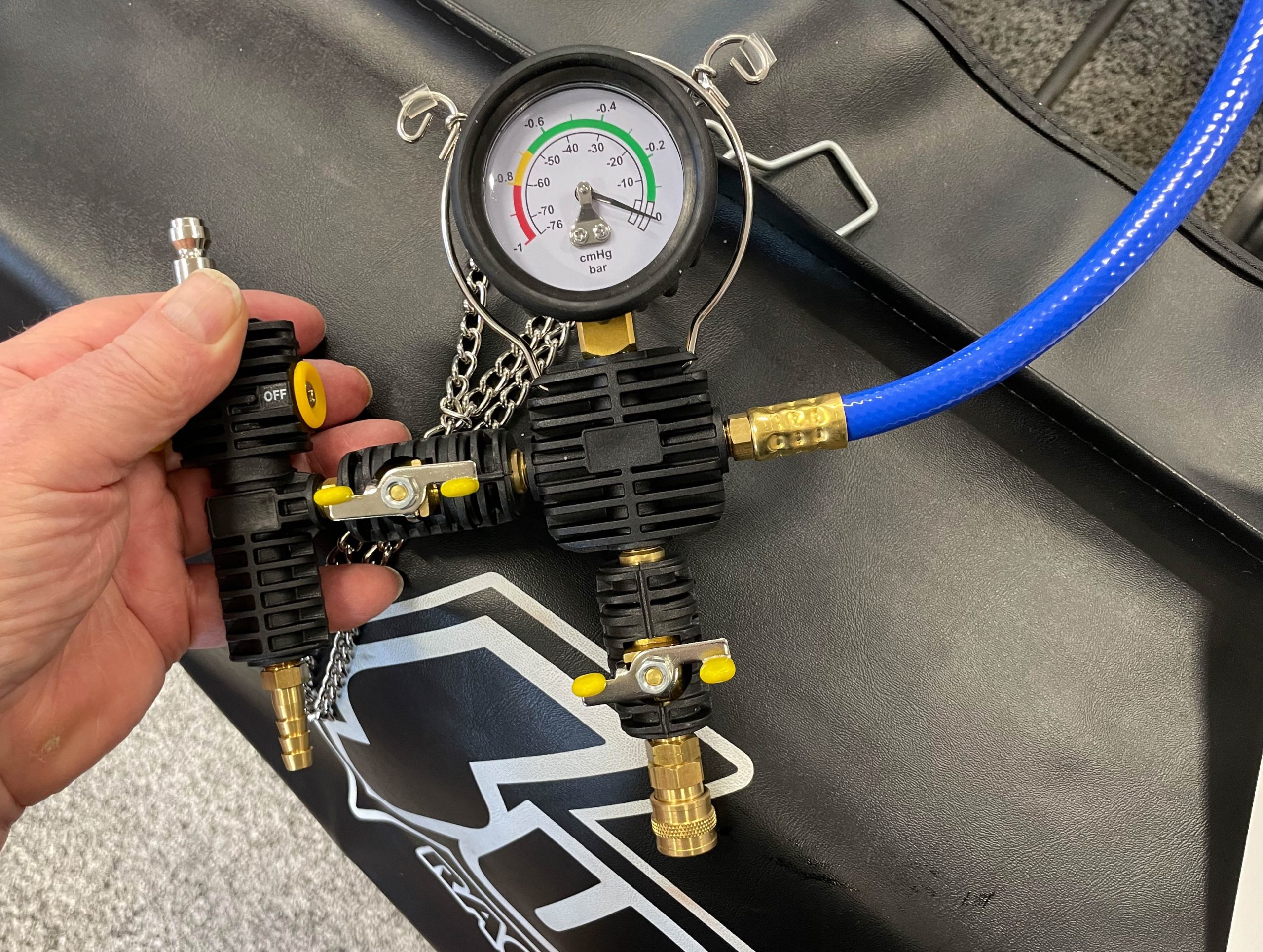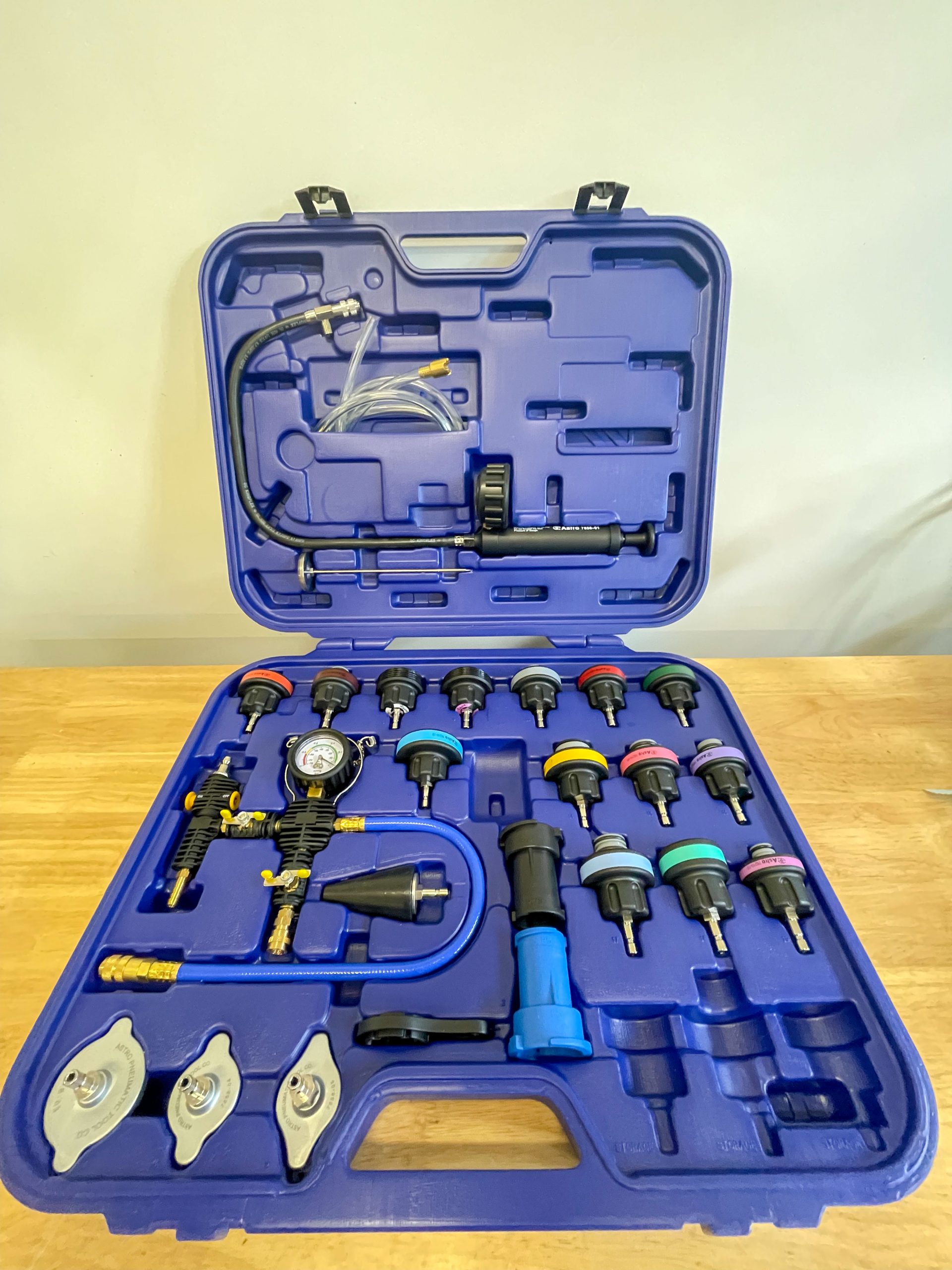 Here’s the Astro Pneumatic Master Universal Pressure Tester and Vacuum System Kit. You get a pressure testing pump with gauge; a purge/refill tool with pressure release and vacuum gauge; radiator cap test adapters; and 17 cap adapters for testing cooling systems on most domestic and import vehicles. (Image/Wayne Scraba)Most of the adapters are numbered and color-coded. The kit comes with a chart showing the applications for each of them. (Image/Wayne Scraba)If none of the adapters work with your radiator, this universal adapter has a pliable rubber body that can be forced into the cooling system filler neck. (Image/Wayne Scraba)The Astro Pneumatic kit includes these adapters that allow you to pressure test your radiator cap. (Image/Wayne Scraba)Here’s the radiator cap pressure testing adapter with a reproduction AC RC15 cap. The cap goes on one end and one of the steel cap adapters is installed on the other. (Image/Wayne Scraba)To pressure-test the radiator cap, attach the cap adapter to the hand pump. Pump to the pressure that matches the radiator cap and watch the gauge. If pressure drops or continues to drop after you reach the cap’s pressure rating, the cap is defective. (Image/Wayne Scraba)The hand pump is also used to pressurize the cooling system to check for leaks. Install the radiator cap on the radiator or the surge/expansion tank. Hook up the pump as shown here and bring the system up to the factory operating pressure (this matches the radiator cap rating). If it holds pressure, all is well. If pressure drops, then you have a leak somewhere. (Image/Wayne Scraba)Setting up the radiator purge/refill tool requires an air compressor. The tool creates a venturi effect, essentially introducing a vacuum in the cooling system. This draws in coolant with little or no chance of creating air bubbles. This hook and chain is used to hang the tool body over the radiator. (Image/Wayne Scraba)The blue hose with the quick coupler attaches to the radiator cap adapter for your application. (Image/Wayne Scraba)The valves on the purge/refill tool are numbered. To start the process, the number 3 valve must be turned open. Open is in line with the fitting. Meanwhile, the number 6 valve just below the vacuum gauge must be turned closed. Closed is 90 degrees to the fitting. (Image/Wayne Scraba)The airline from your compressor hooks up to the tool as shown. Push the yellow slide button to “on” as shown and wait until the vacuum gauge reads between 50-60 cm/HG. Turn the Number 2 valve to the off position (90 degrees to the fitting), then slide the button to “off”. (Image/Wayne Scraba)Connect the quick coupler on the supplied clear coolant hose to the tool. The other end of the hose is submerged in a container of coolant. (Image/Wayne Scraba)Turn the number 6 valve to the open position. The tool will then automatically refill the cooling system. The refill is complete when the vacuum gauge reads zero. During the process, keep an eye on the coolant level—you don’t want the supply hose to start drawing in air. Double check the amount of coolant in the system, too. You might have to add a small amount manually by very slowly pouring in the coolant. You don’t want to create bubbles. (Image/Wayne Scraba)