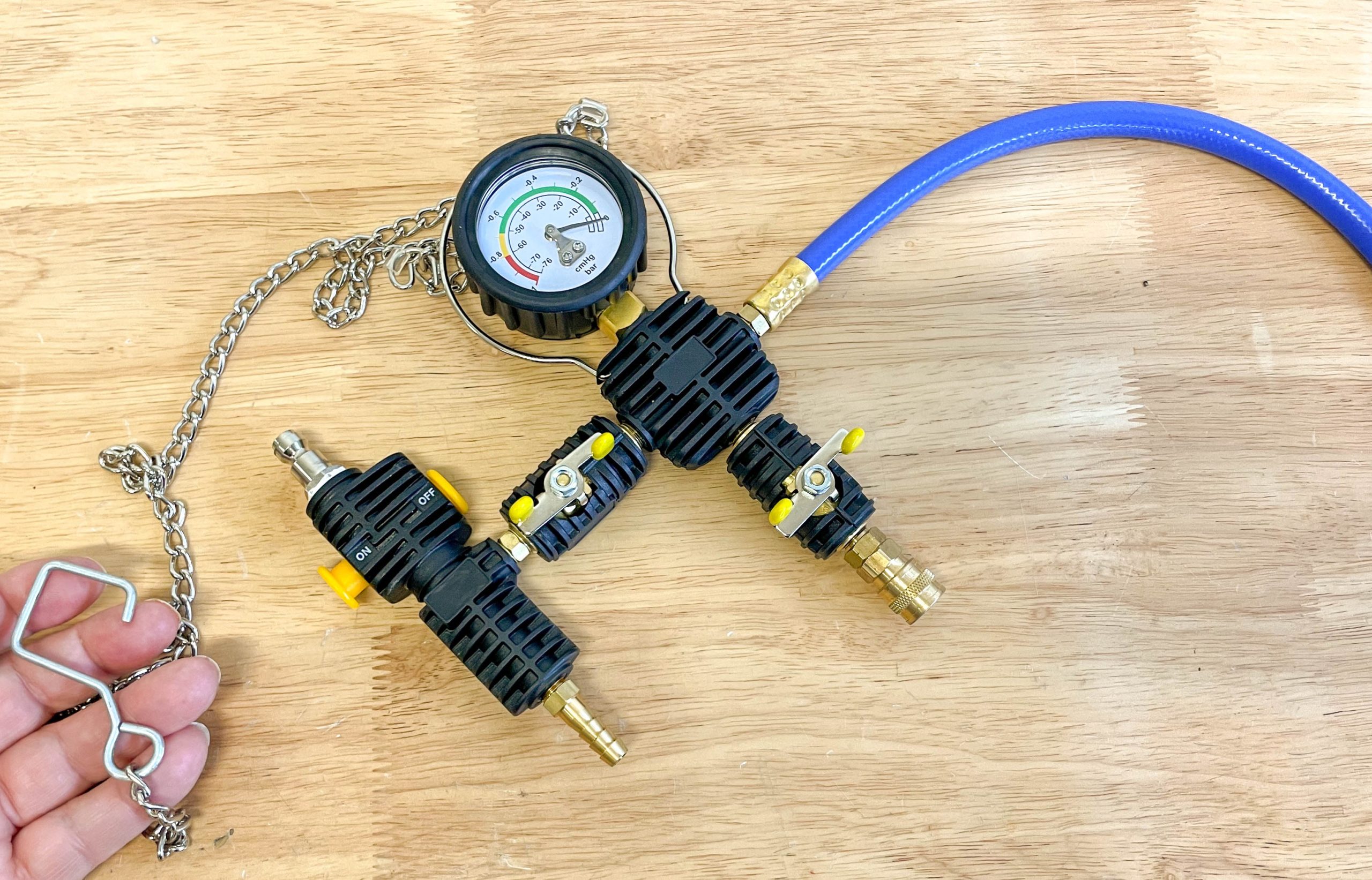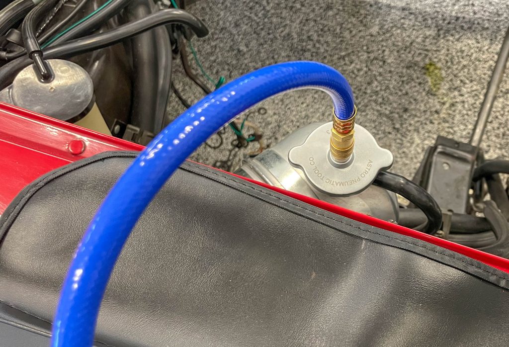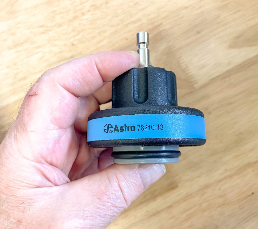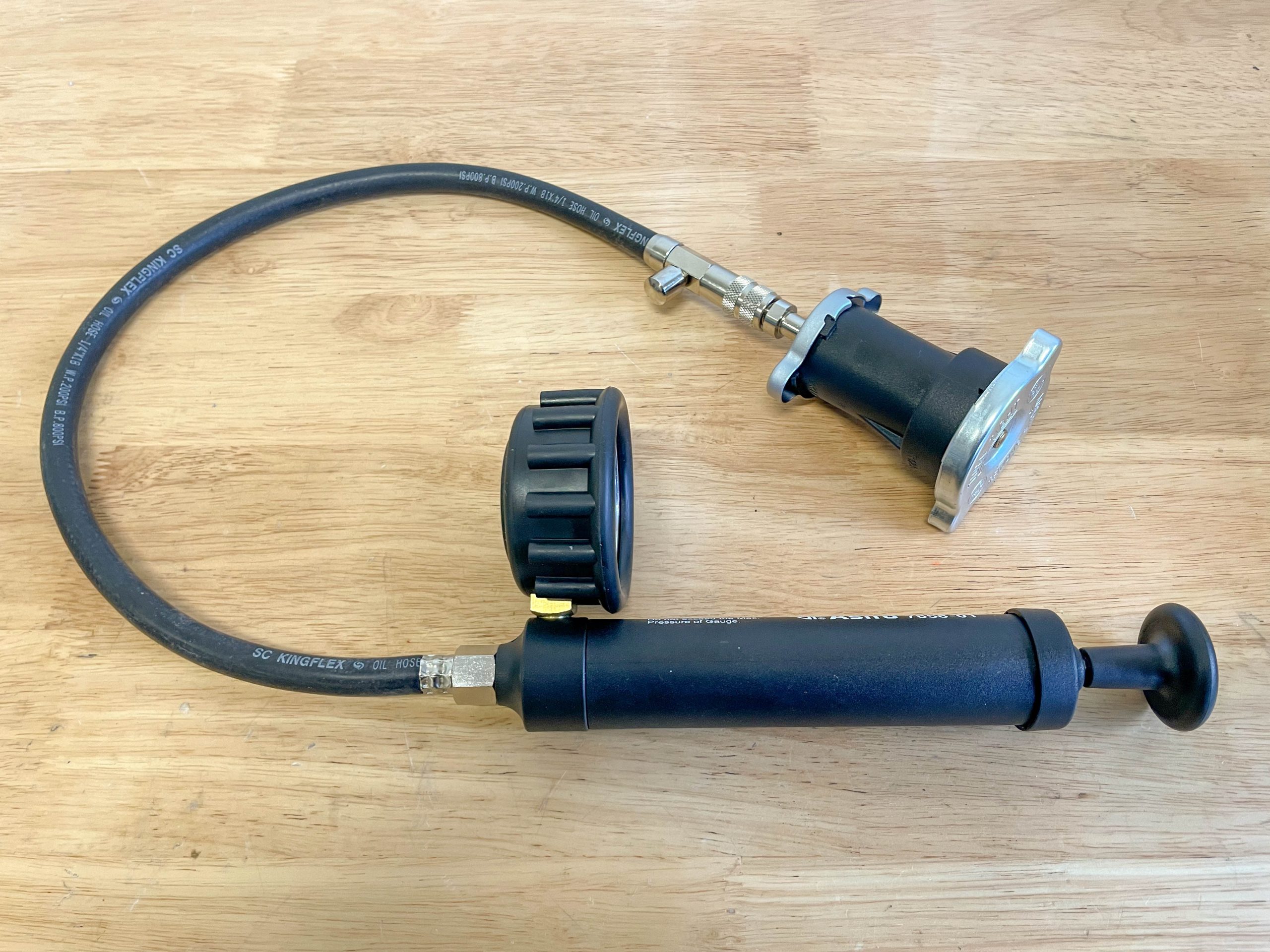 There are better ways, of course. One is to use a tool like Astro Pneumatic’s Master Universal Pressure Tester & Vacuum System Kit. This kit allows you to pressure test the cooling system and radiator cap as well as purge and vacuum fill the cooling system. It’s all pretty slick.
