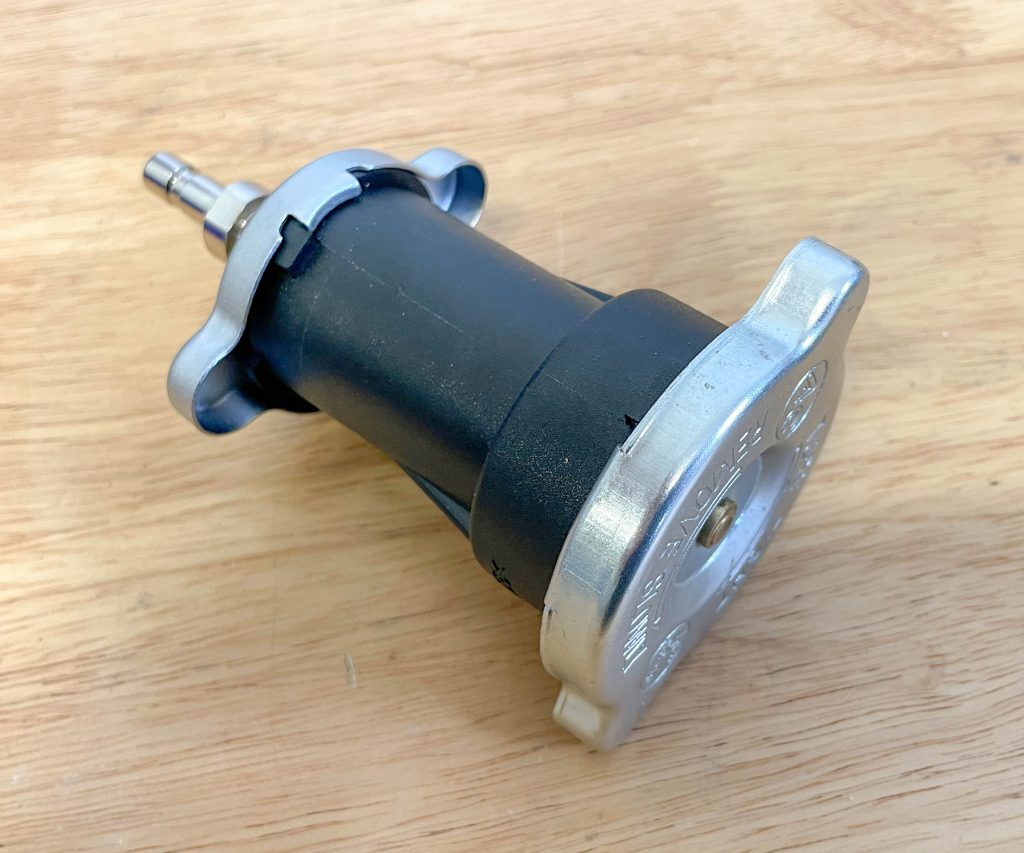 Case-in-point is the radiator cap pressure tester. The kit provides two adapters. Just choose one that accepts your cap and select the appropriate steel test cap from the kit–there are three of them and each has a steel quick coupler fitting at the top. To use, install your radiator cap on one end and the test cap on the other. Attach the hand pump from the kit and pump it to up the pressure specification for your cap. You’ll quickly find out if it holds the pressure or not. I tested a 15 PSI cap and it checked out OK at just under that number.