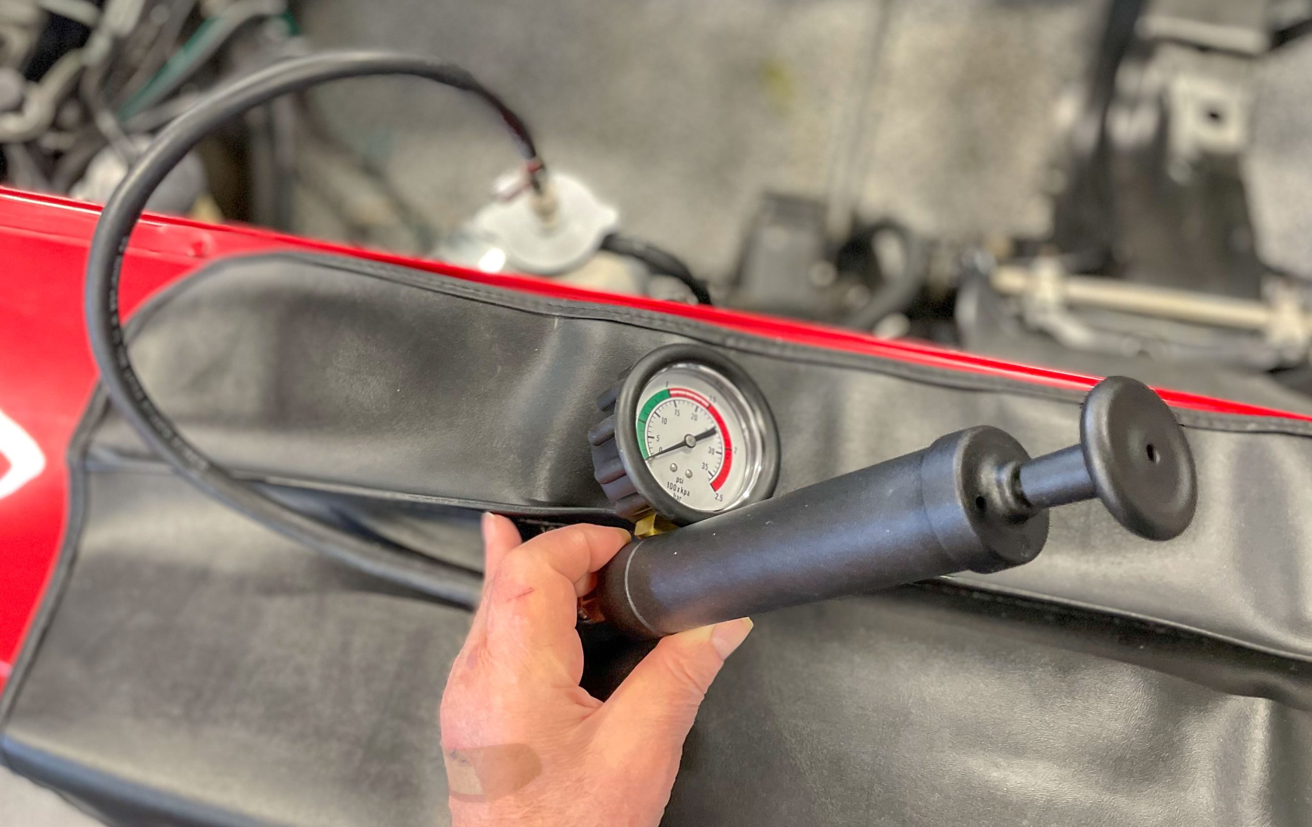 Testing the cooling system for a leak works much the same way. This time, select the cap adapter that fits your radiator or surge/expansion tank. With the vehicle cooled down, replace the radiator cap with the cap adapter, attach the hand pump, and pump it to the desired operating PSI (it should be the same rating as the radiator cap). Watch the gauge as you reach operating pressure. If the pressure drops on the gauge, you know there’s a leak in the system somewhere.