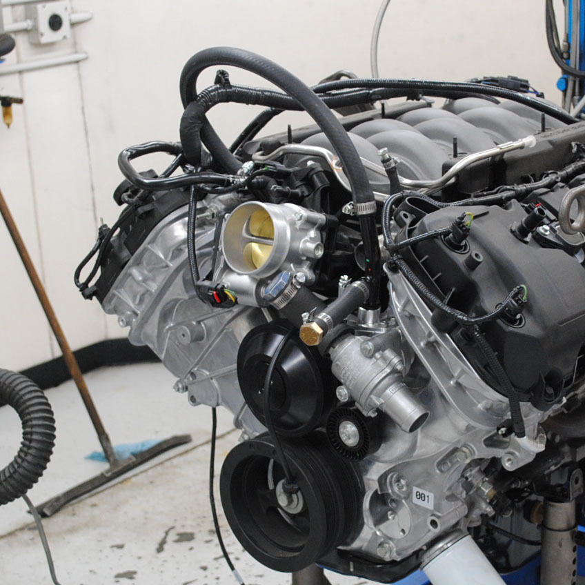 In addition to variable cam timing, the 5.0L Coyote also featured an 80mm drive-by-wire throttle body. Note also the lack of accessories and Meziere electric water pump. (Image/Richard Holdener)