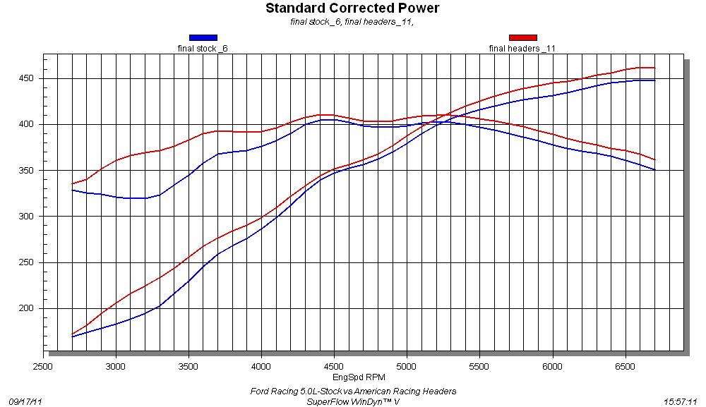 Equipped with the headers, the peak power numbers jumped to 462 hp at 6,600 rpm and 411 lb.-ft. at 4,400 rpm, but the torque output was up by as much as 49 lb.-ft. at 3,200 rpm.