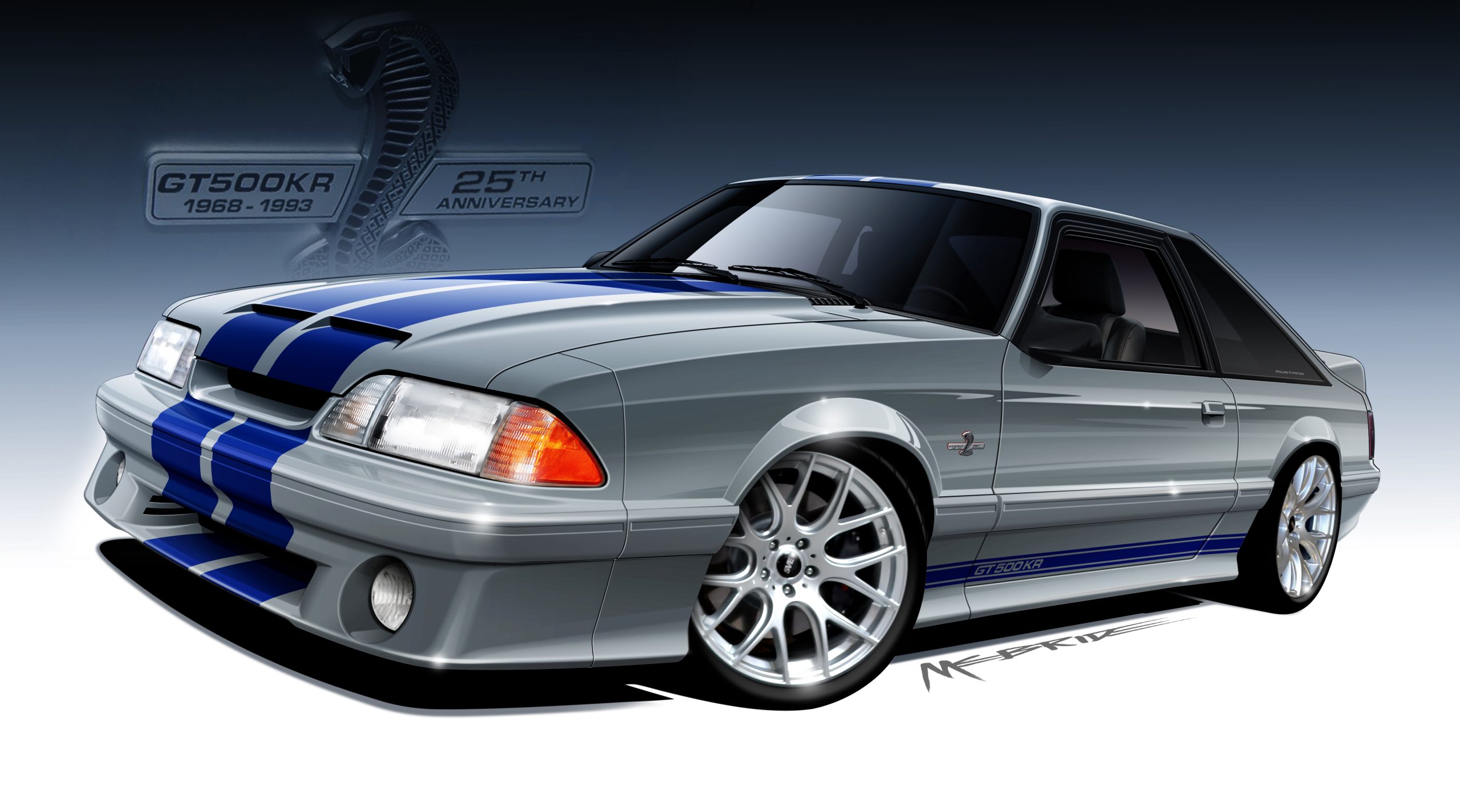 King Snake: This Cobra concept is more than just a wheel and stripe package. A GT500KR-themed 1993 Cobra build would be a real showstopper! If the silver and blue paint scheme doesn’t catch your eye, then maybe the 2008 Shelby GT500KR supercharged powerplant under the modified Cobra-style hood with ram air will. Other modifications include staggered fitment 18-inch custom wheels and tires, six-speed transmission, full array of suspension mods and a fully outfitted Shelby-themed leather interior. (Illustration/John McBride)