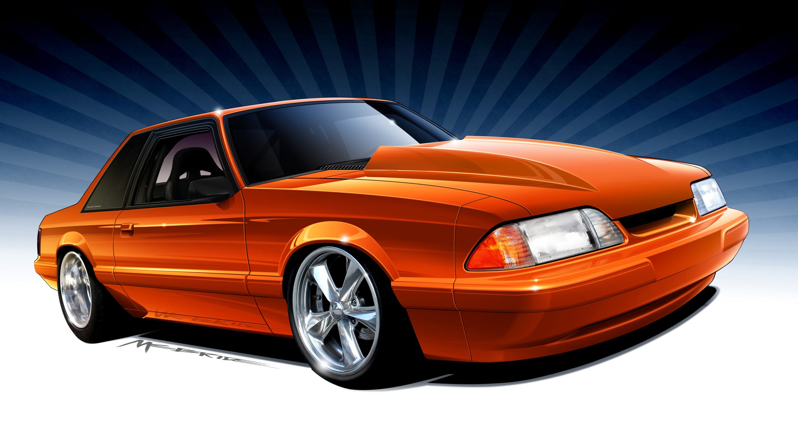 Boss Fox: The Boss Fox concept starts out as a 1987-’93 Mustang LX hatchback. Power would be supplied by Ford’s new Boss Coyote 5.0 engine backed up with the factory six-speed transmission. Go wild with the suspension and bolt up a full tubular K-frame system, coil overs, and a Watt’s Link rear to help keep this Pony planted in the corners. A 5-lug conversion and a big brake kit will be in order. A staggered-width wheel and tire combo with throwback styling feel right at home on this Boss concept. Exterior modifications include deleting the factory side moldings and adding a set of custom-smoothed LX front and rear bumpers covers. Other exterior mods include a unique front chin spoiler, rear duck-tail spoiler, and a satin black hood treatment to finish off the look. This pony will perform like a Boss! (Illustration/John McBride)