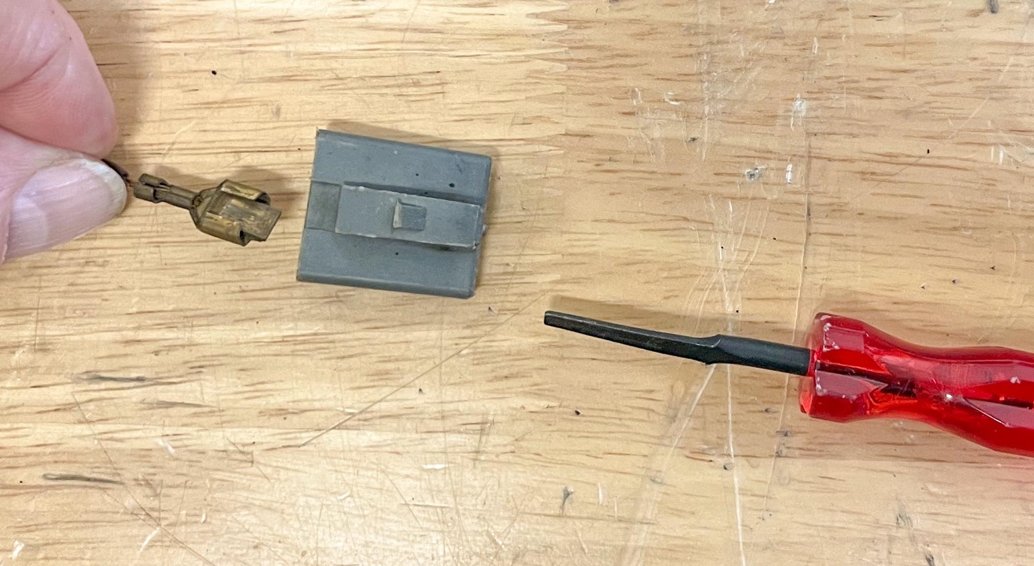 - If you’ve closed the tab sufficiently, you’ll be able to remove the wire and terminal from the back side of the connector