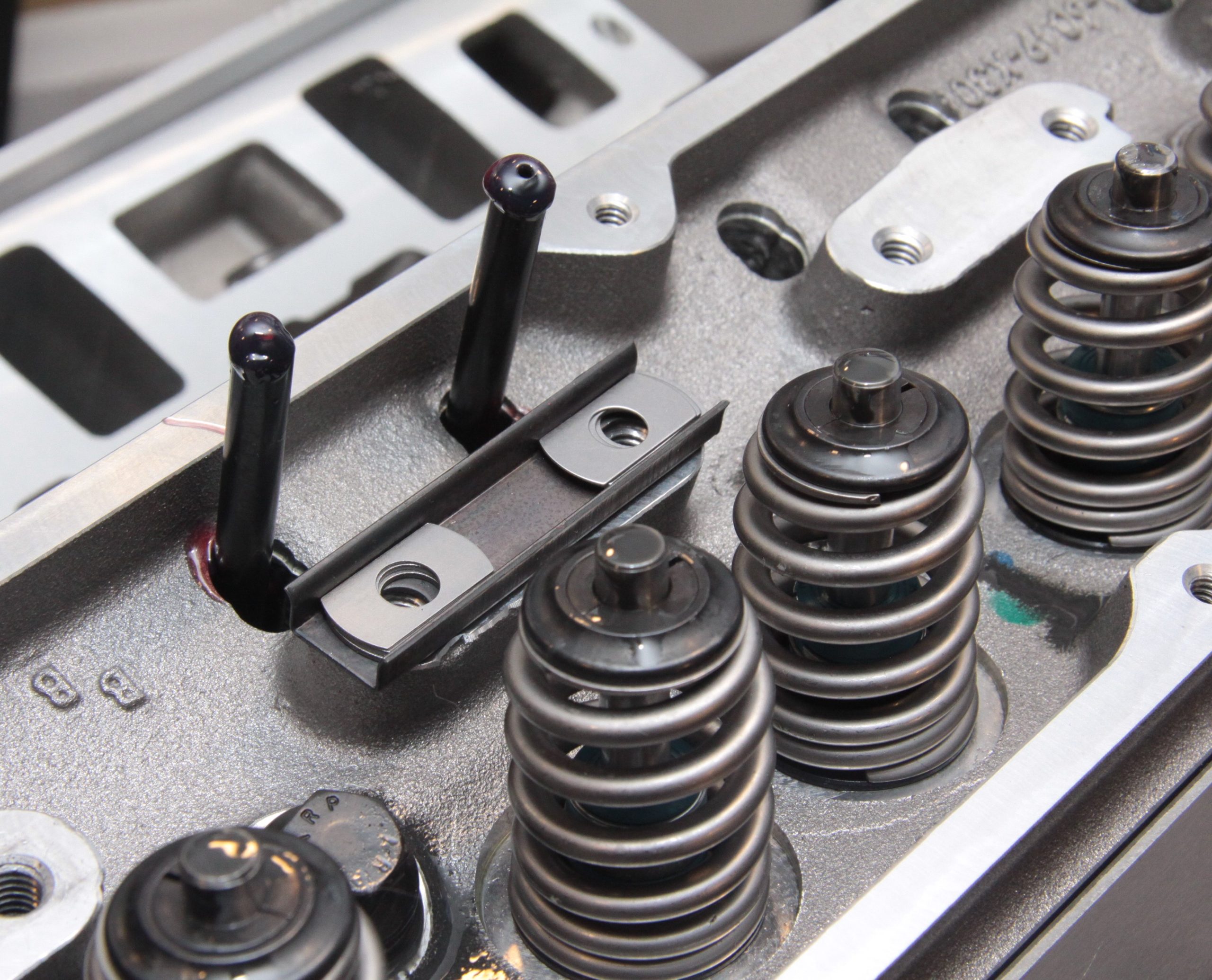 The X2 heads use pedestal-mount rocker arms. These Ford Performance pedestal rocker channels tie the rocker arms together to keep them properly centered over the valve stem tips. One channel connects two rockers together. Jeff used Ford Performance rocker pedestal shims to accurately set valvetrain geometry, adding or subtracting shims as necessary. (Image/Jim Smart)