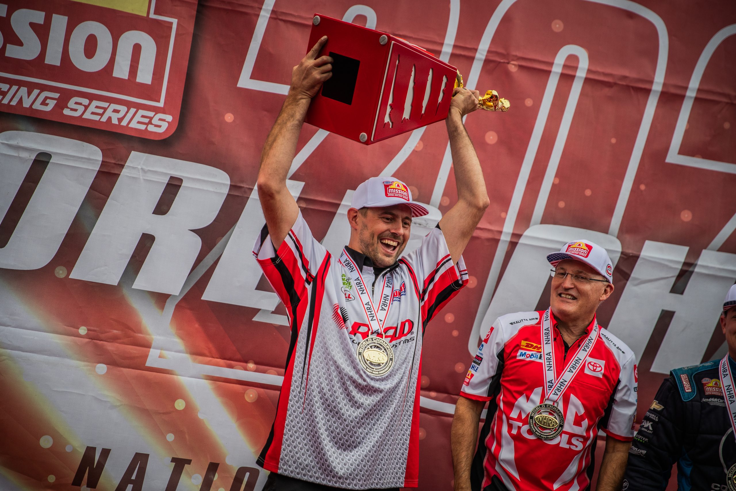 After a hard-fought battle Dallas Glenn hoisted his first NHRA World Championship trophy. (Image/Kalyn Guenther)