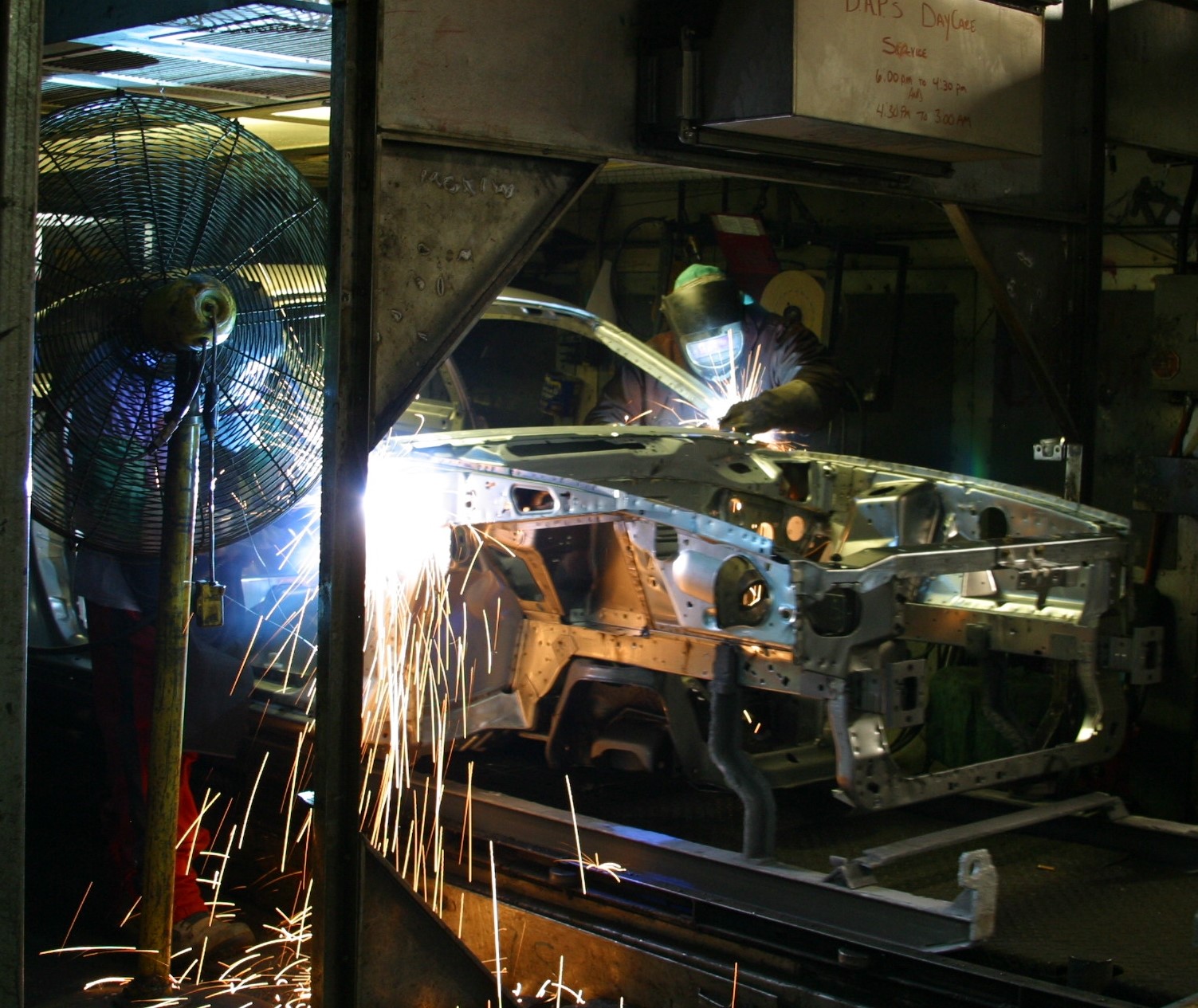 Alan Honeycutt, Body Line Superintendent, walked me through the process of building Mustang bodies. It was much the same as it was in 1964, though with much closer attention to detail as manufacturing standards had become quite strict by 2004. A platform was assembled from three sections—the front-end, center section, and the trunk pan. These were built on subassembly lines off the main body line. Completed platforms were moved into a holding area. The body line kept additional platforms on hand in case there was an equipment failure or a shortage of parts. This allowed production to run smoothly with plenty of platforms on hand.