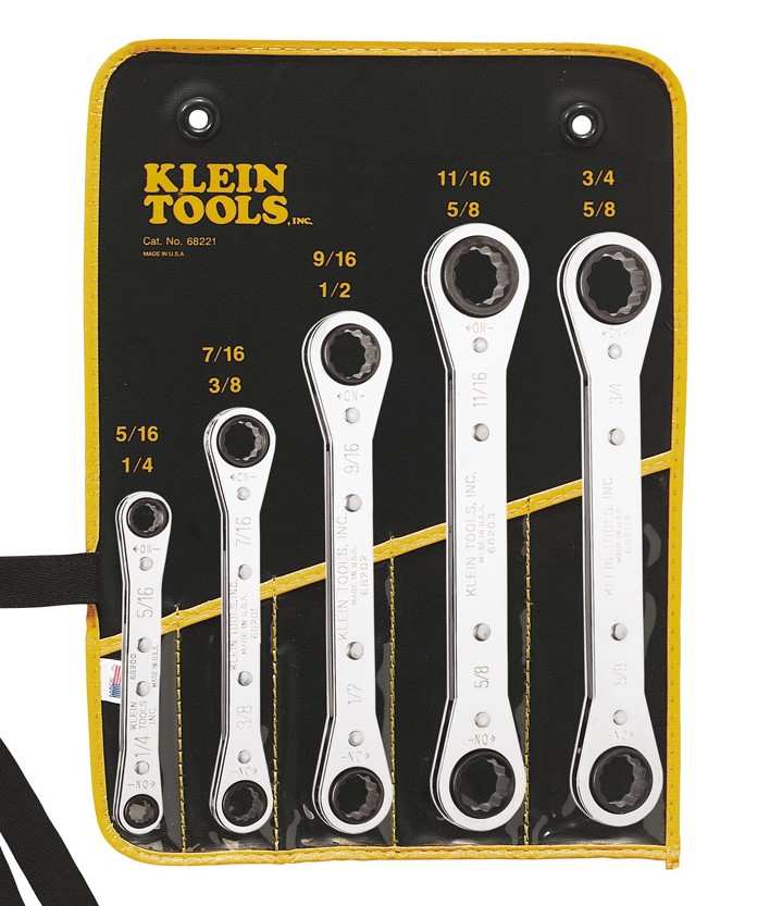 This Klein Tool Flat Face Wrench Set includes five SAE wrenches, each with a different size on each end. You flip them over to reverse the ratcheting direction. The wrenches are also available separately. (Image/Summit Racing)